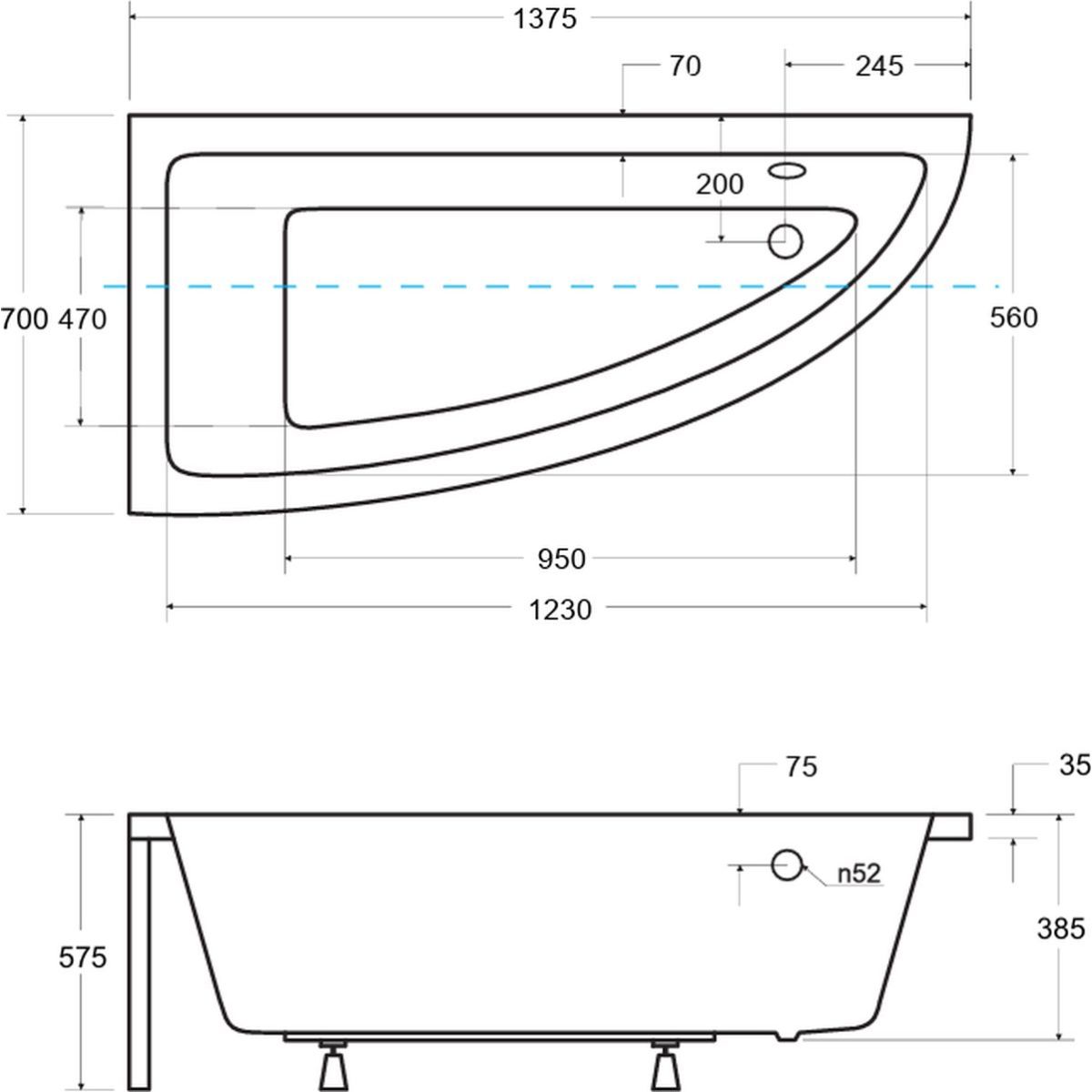 Körülbelül 30 - 35 cm párhuzamos a hosszú oldallal, majd a kád szűkülése következik be.