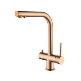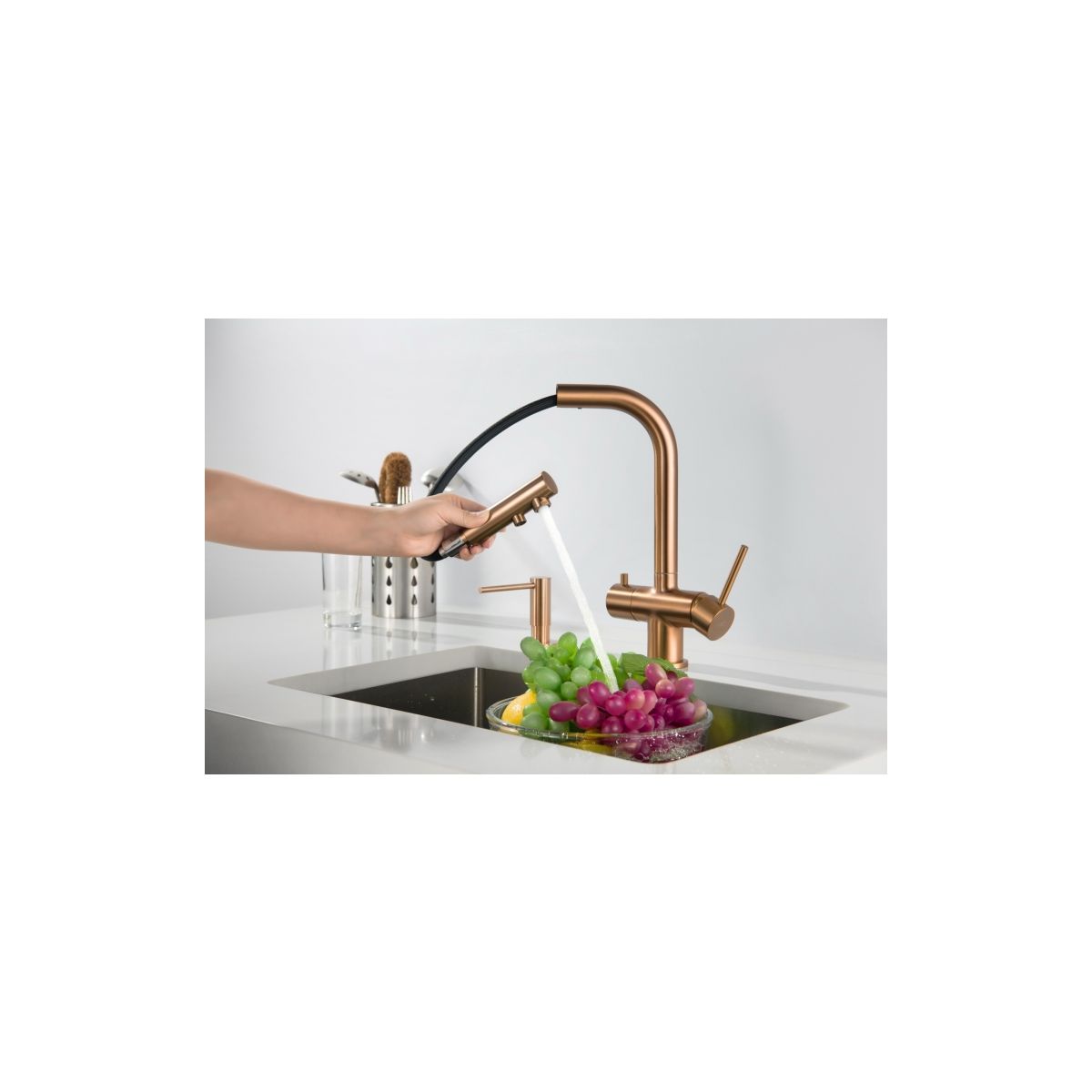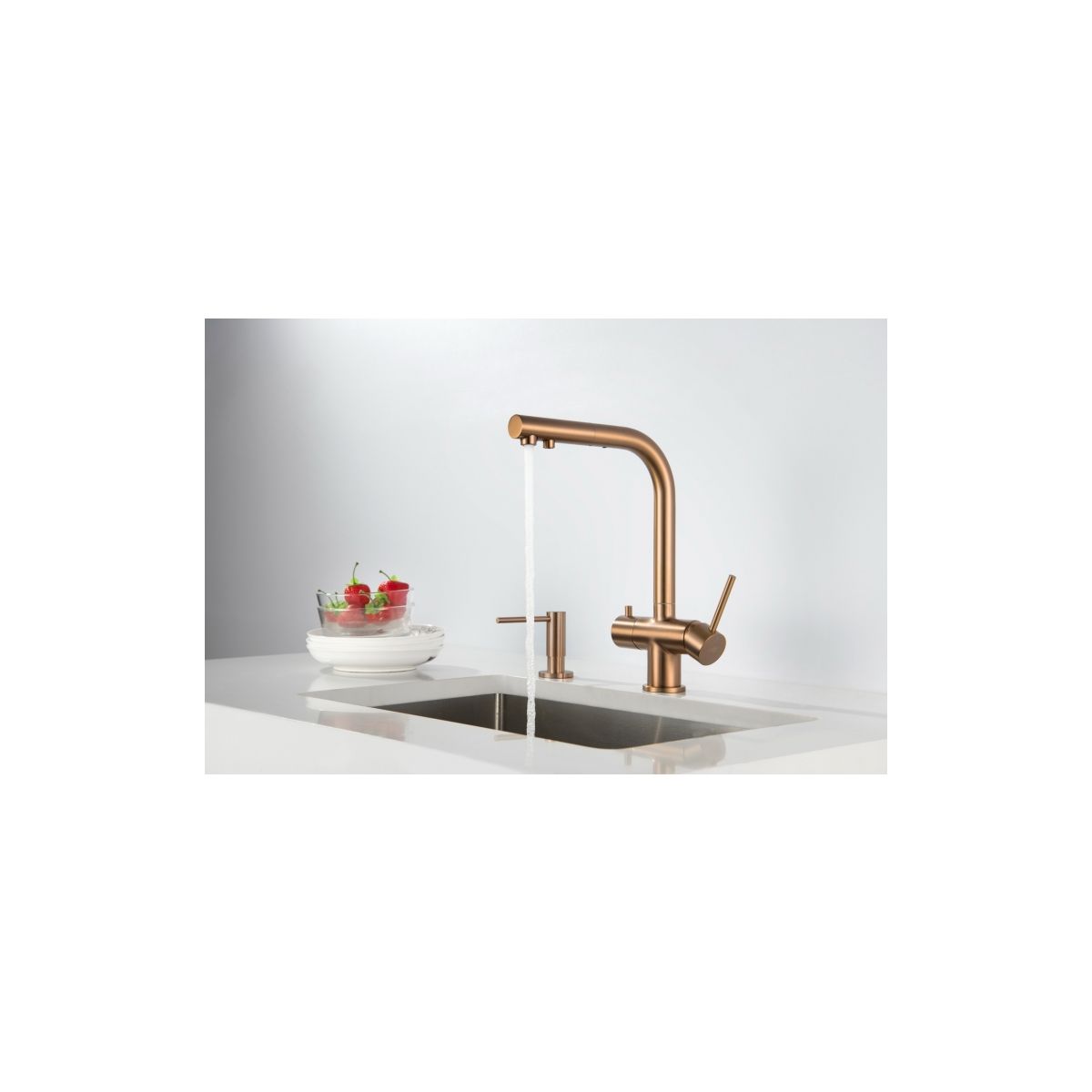 - Ez egy csúcsminőségű termék, amely tartósságával, kiváló kivitelezésével, funkcionalitásával és egyedi kialakításával tűnik ki. Ezeknek a tulajdonságoknak köszönhetően a csaptelep különböző stílusú belső terekbe is illeszkedik. Ezenkívül a rézbevonat ellenáll a szennyeződésnek, a korróziónak és a rozsdának. Intenzív használat mellett is megőrzi gyönyörű megjelenését.