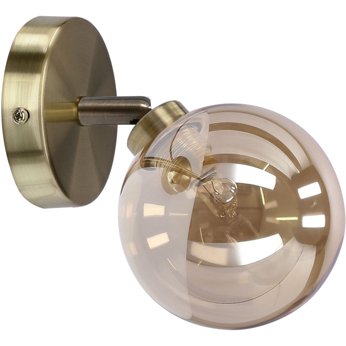 A legújabb RODIA kollekcióból származó fali lámpa. A lámpa patinás talpa harmonizál a zárt gömb alakú borostyánszínű lámpaernyővel. A lámpa állítható.