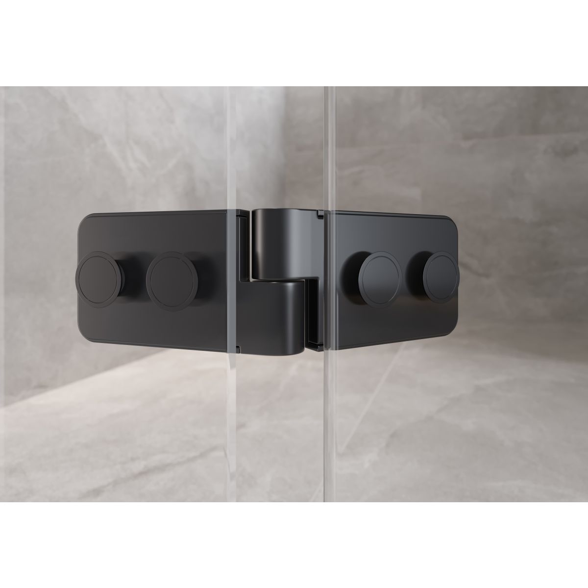 A zuhanykabin 6 mm vastag edzett biztonsági üvegből készült, amely biztosítja a szerkezet stabilitását és garantálja a biztonságos használatot. Az üveg CleanPro hidrofób védőbevonattal rendelkezik, amely hatékonyan megakadályozza a vízkő és a szennyeződés lerakódását, megkönnyítve a zuhanykabin tisztán tartását. A zuhanykabin belső oldalán az üveggel síkban lévő fém zsanér emelő és süllyesztő funkcióval rendelkezik, ami meghosszabbítja a tömítések élettartamát. Az innovatív zsanérmechanizmus lehetővé teszi, hogy az ajtó 90°-os nyitáskor lefékeződjön, így védelmet nyújt a véletlen ütődések ellen. A kiváló minőségű fémből készült kétoldalas fogantyúk a tartósságot és a funkcionalitást ötvözik. Az állítható falprofil nagyobb telepítési rugalmasságot biztosít, mivel egyenetlen falakon is használható. A mágneses tömítések és a küszöbcsík megakadályozzák a víz kiszivárgását a burkolatból, így garantálva a legmagasabb szintű vízzáróságot. Négyszögletes sarokzuhanykabin. Bal oldali változat. Lengőajtó pontszerű zsanérokkal. Profilok matt fekete színben. Átlátszó üveg. Magasság 195 cm. A zuhanykabint úgy tervezték, hogy a zuhanytálcával együtt vagy közvetlenül a padlóra szerelhető legyen. A zuhanykabin kiegészítéseként különböző színű és magasságú zuhanylefolyók és zuhanytálcák széles választéka áll rendelkezésre, ami lehetővé teszi a szabad konfigurálást. A termék magas minőségét hosszú garancia igazolja.
