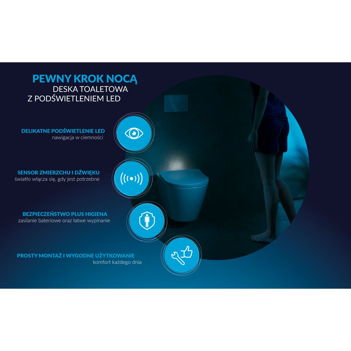 A Cersanit ovális, falra szerelhető LARGA PRO WC-csészéje, amely CERSANIT VORTEX örvényös öblítési technológiával van felszerelve, kivételes tisztítási hatékonyságot és csendes működést biztosít. A 2/4 literes kettős öblítésnek köszönhetően a csésze rendkívül takarékosan használja a vizet, miközben teljes öblítési hatékonyságot biztosít. Az erős, pontosan irányított vízáram alaposan megtisztítja a csésze teljes felületét, növelve a higiéniai és használati kényelmet. Egy négytagú család évente akár 20 000 liter vizet is megtakaríthat, így a LARGA PRO környezetbarát és költséghatékony megoldás. A falra szerelhető WC-csésze ultra-sima mázzal van bevonva, ami csökkenti a szennyeződések felhalmozódását és megkönnyíti a tisztán tartást. Áramvonalas belső alakja javítja az öblítés dinamikáját, külső megjelenése pedig modern, elegáns megjelenést kölcsönöz a fürdőszobának. Ezenkívül a WC rejtett rögzítési rendszerrel van felszerelve, amely teljesen elrejti a rögzítőelemeket. A CERSANIT VORTEX rendszer csendes működése kényelmesebbé teszi a fürdőszoba használatát. A csésze funkcionalitását kiegészíti az innovatív MOONWAY SPOT WC-ülés intelligens LED-es világítással, amelyet a háztartás minden tagjának kényelme és biztonsága szem előtt tartva terveztek. A szürkület- és hangérzékelő által automatikusan aktivált lágy fény éjszaka finoman megvilágítja a teret, lehetővé téve a fürdőszobában való biztonságos mozgást – anélkül, hogy be kellene kapcsolni a fő világítást, és anélkül, hogy felébresztené a háztartás többi tagját. A diszkrét világítás megkönnyíti a sötétben való eligazodást és csökkenti a botlás kockázatát, különösen gyermekek és idősek esetében. Az ülés kiváló minőségű, hőre keményedő műanyagból készült, vékony SLIM formájú, ami biztosítja a tartósságot és a modern megjelenést. A soft-close funkció csendes zárást garantál, az AAA elemről való táplálásnak köszönhetően nincs szükség elektromos szerelésre, az EASY-OFF rendszer pedig lehetővé teszi az ülés gyors eltávolítását és könnyebb tisztítását. A tökéletesen illeszkedő fehér árnyalat biztosítja a Cersanit kerámiákkal való teljes színegységességet.