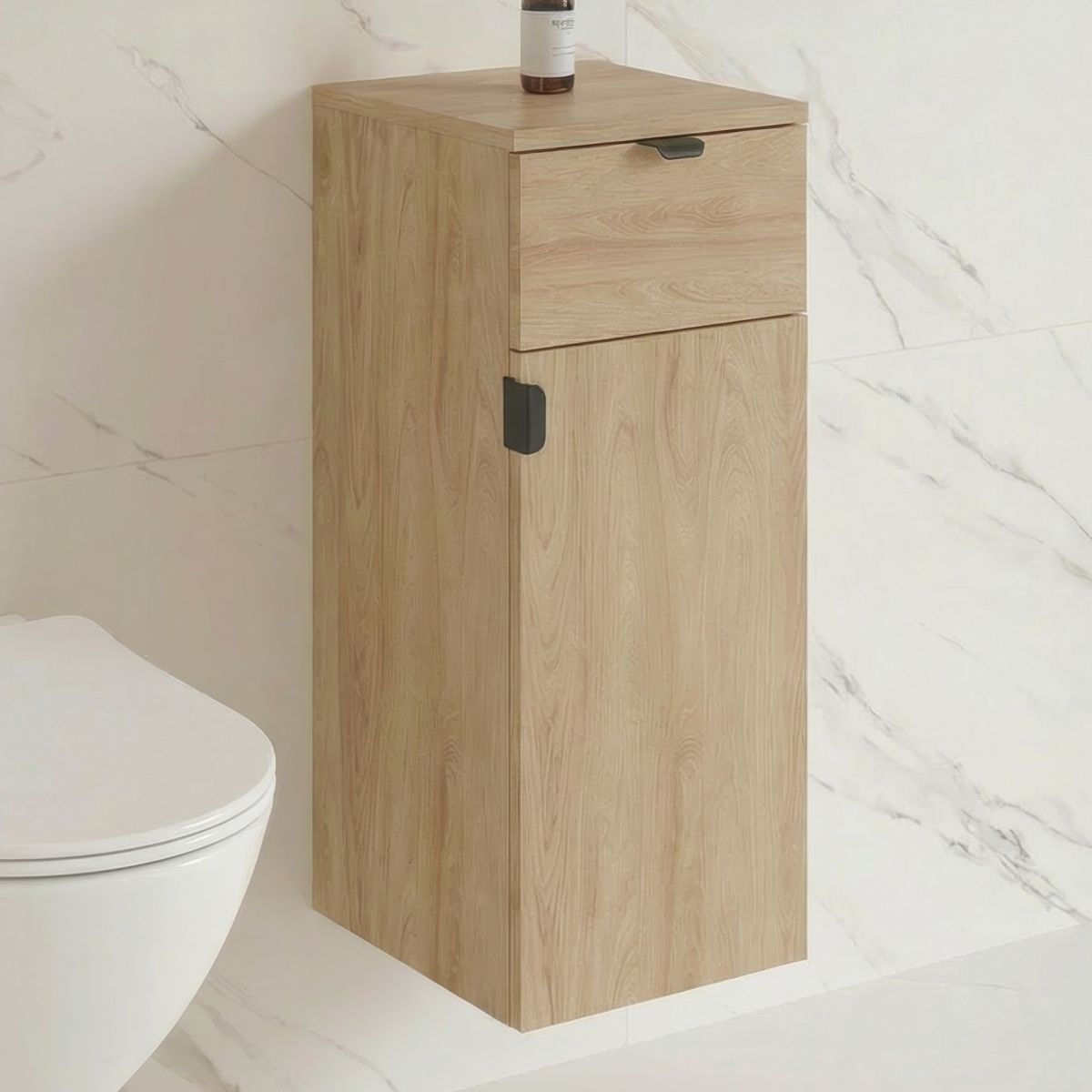 - Az OVIDA fürdőszobai félszekrény hikora tölgy színben egy praktikus és esztétikus megoldás, amely lehetővé teszi a fürdőszobában rendelkezésre álló tér maximális kihasználását. A fa természetes színe meleg, otthonos hangulatot kölcsönöz a belső térnek, és tökéletesen illeszkedik a modern berendezésekhez. A bútor egy fiókkal és egy ajtóval rendelkezik, amely mögött egy polc található, kényelmes tárolóhelyet biztosítva a tisztítószereknek, fürdőszobai vegyszereknek és tartalék kiegészítőknek. A fiók kiválóan alkalmas kozmetikumok és apró tárgyak tárolására. A soft close mechanizmus garantálja a csendes és sima záródást, növelve a használati kényelmet.