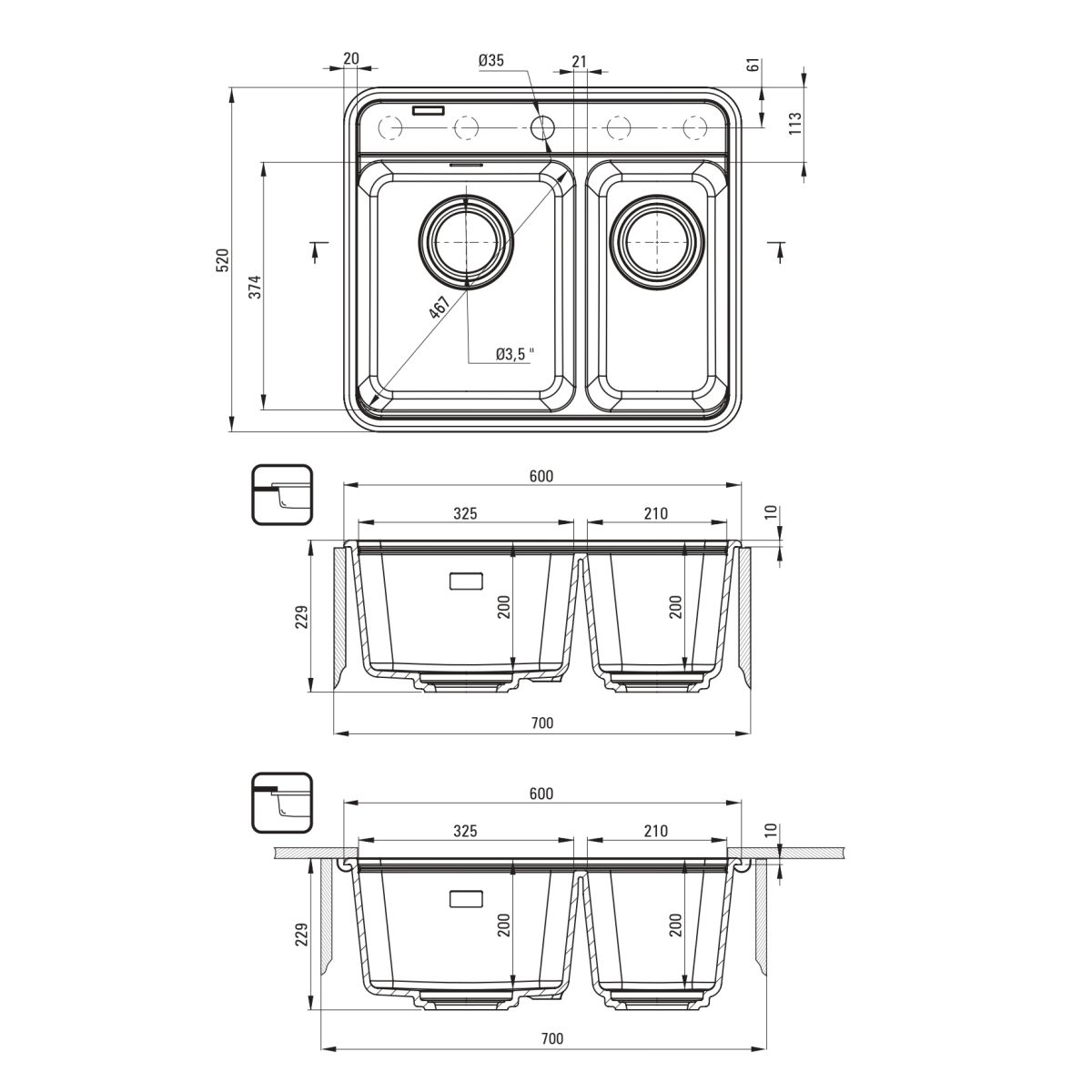 - mosogató beépítési rendszere: lapba süllyesztve, beépítés alatt, beépítve, köténnyel