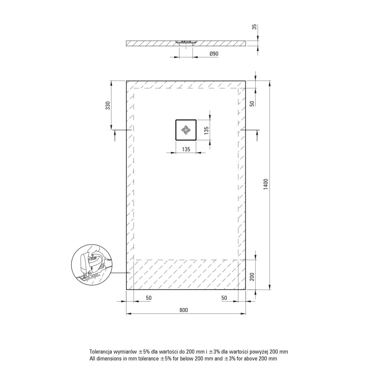 - SOLID PLUS technológia - kompozit töltés, a zuhanytálca kivágásának lehetősége a rajzon megjelölt helyen