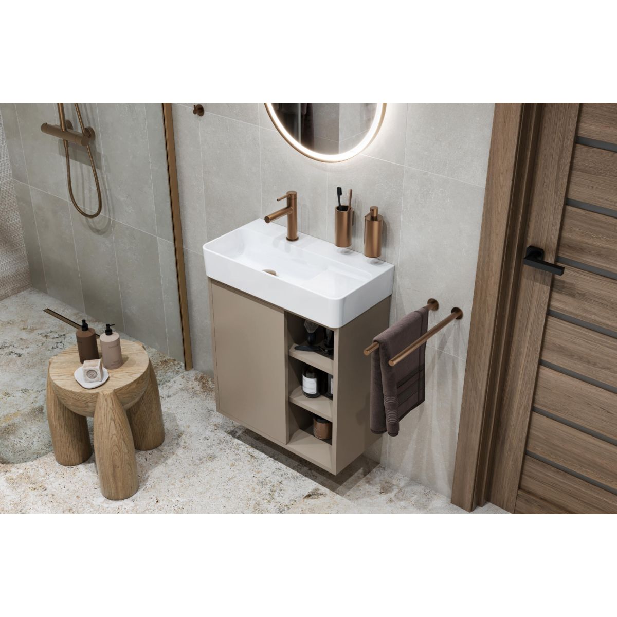 A funkcionális kialakítás ötvözi a kényelmet az esztétikummal. A csendes zárórendszerrel ellátott ajtókkal ellátott zárható rész diszkréten elrejti a vízvezetékeket, miközben további tárolóhelyet kínál. A nyitott polcok könnyű hozzáférést biztosítanak a legszükségesebb kiegészítőkhöz, illetve dekoratív funkciót is betölthetnek.