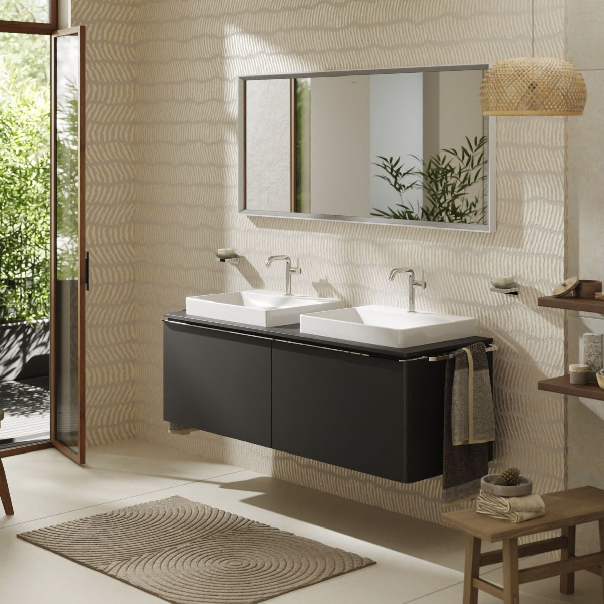 Tervezze meg álmai fürdőszobáját az egész család számára a hansgrohe Xelu fürdőszoba bútorcsaládjával. Ez az elegáns munkalap két kivágással rendelkezik, így két hansgrohe Xelu sorozatú polírozott, egymás mellé helyezhető mosdókagylót helyezhet el. Ez az elrendezés exkluzivitást sugároz, és lehetővé teszi, hogy a reggeli és esti rutin során együtt töltsék az időt. A munkalap illeszkedik a Xelu fürdőszobabútorok felületi színeihez, és négyféle változatban kapható: magasfényű fehér, matt gyémántszürke, természetes tölgy és sötét dió. Így lehetővé teszi a mindennapi családi igények és a személyes stílus megoldásának ügyes kombinációját. Jobb design és magasabb szintű mindennapi kényelem.