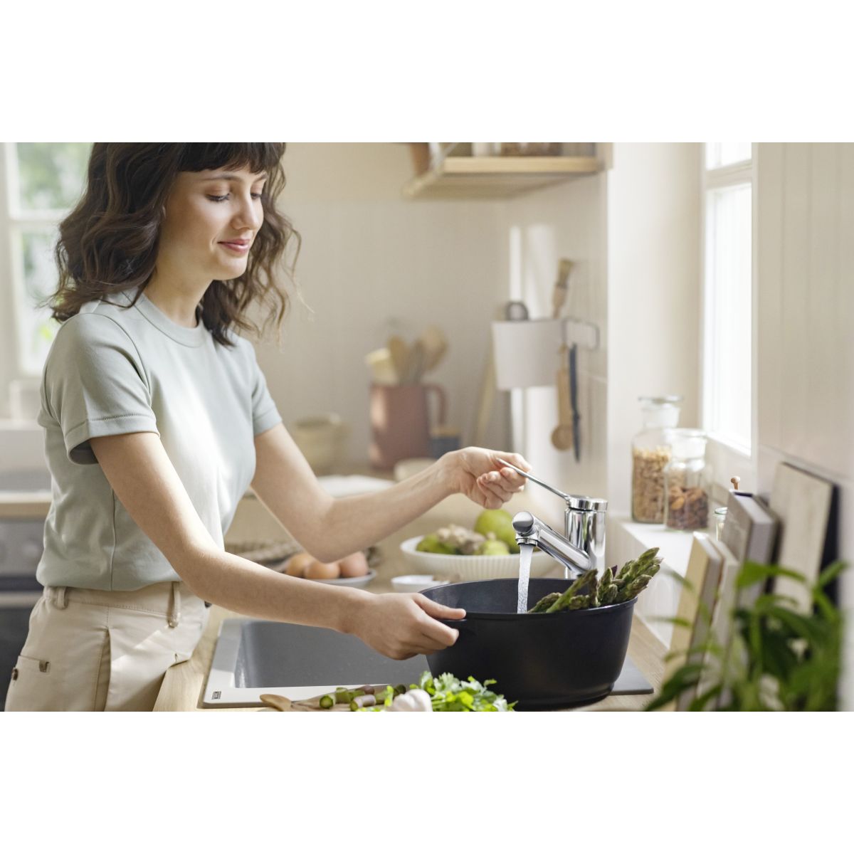 A Zesis 200 konyhai keverő elzárószeleppel tökéletes választás a berendezés cseréjéhez vagy első alkalommal történő beszereléséhez. Ez az elegáns konyhai keverő hasznos funkciókkal és a Hansgrohe termékekre jellemző magas minőséggel könnyíti meg a mindennapi teendőket.