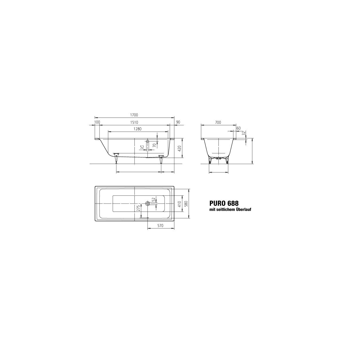 A PURO fürdőkád főbb jellemzői oldalsó túlfolyóval: