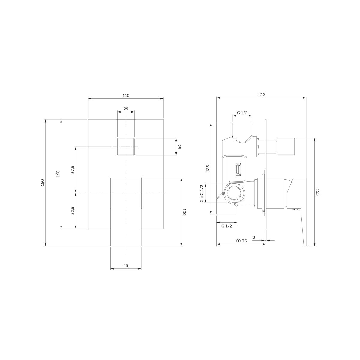 - két bemenet (hideg és meleg vízhez): 1/2", két vegyes vízkimenet: 1/2"