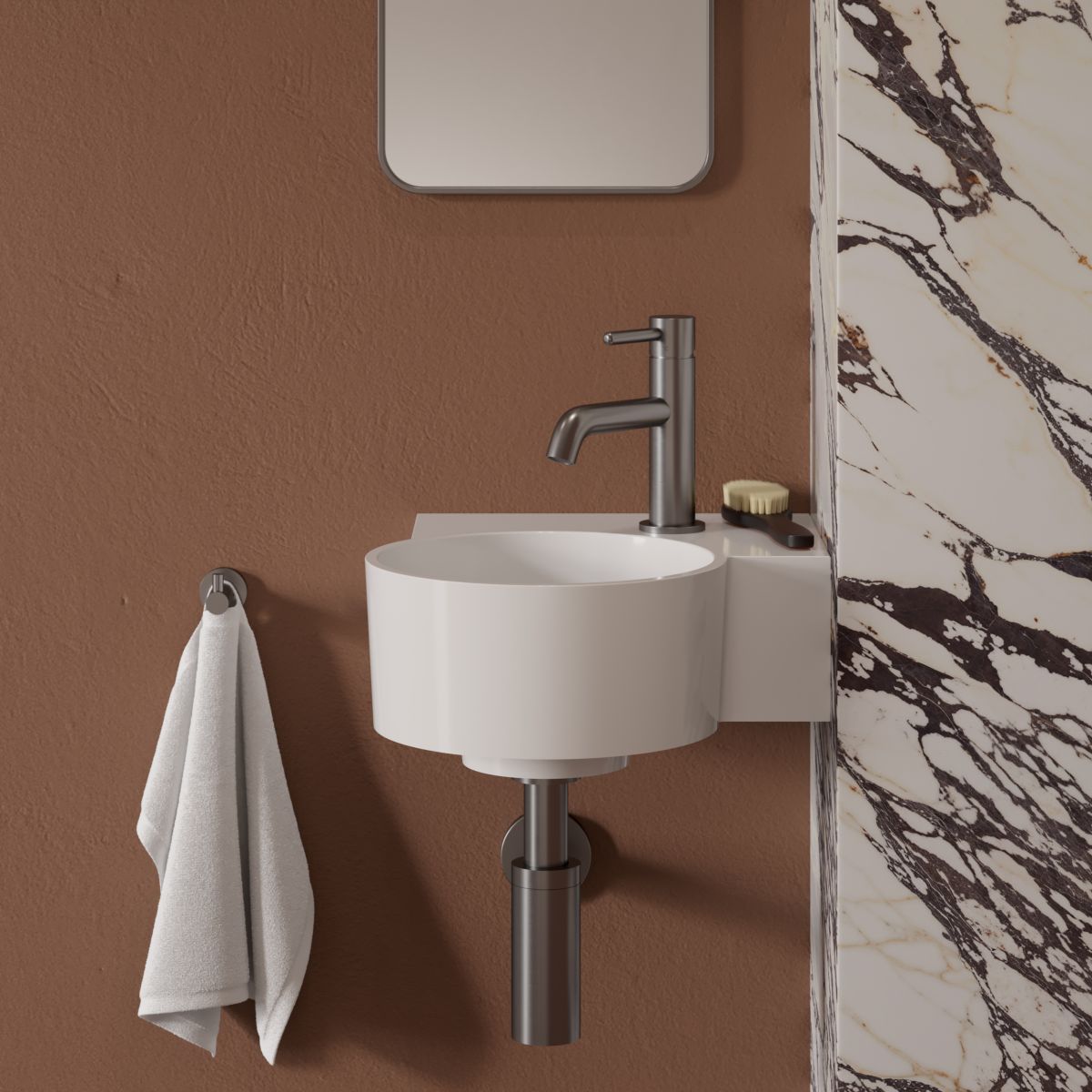 A mosdó M+ kompozit anyagból készül, amelynek fő összetevője a dolomit kőzet. Az innovatív gyártási technológia minden részletben tökéletes kivitelezést garantál, miközben kivételes tartósságot és ellenállóságot biztosít.