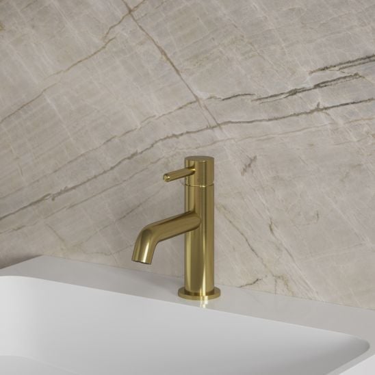 A szálcsiszolt sárgaréz nemes kivitelű, hűvös arany árnyalatú, szatén csiszolt felületű. A bevonatot fejlett PVD-technológiával állították elő.