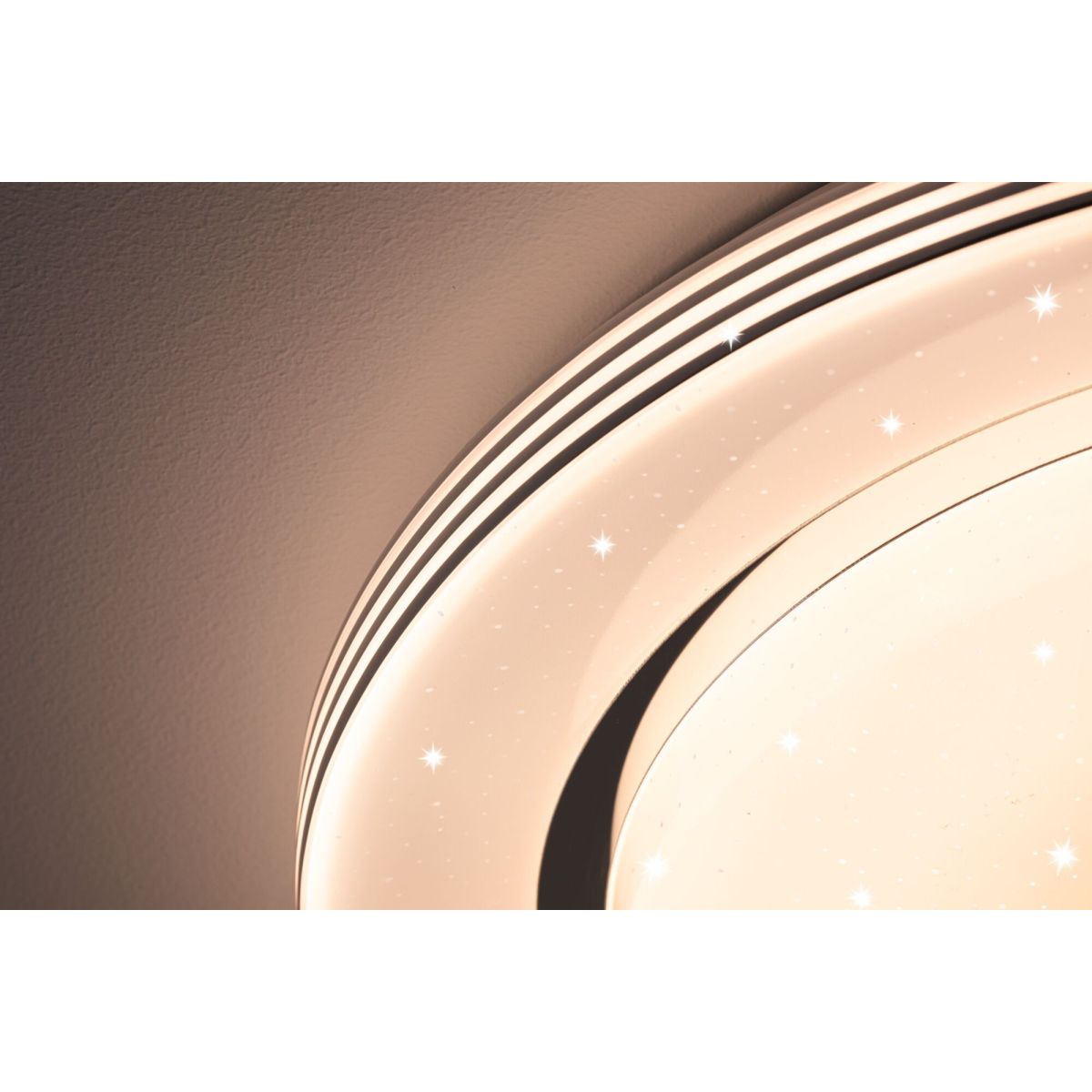 A fényerőszabályozható lámpa alkalmas világos általános világításként vagy színes fókuszpontként a nappaliban. A csillagos égbolt különleges, érdekes fényhatásokat biztosít. A fény színe a Tunable White funkcióval szabadon állítható: a munkához szükséges fehér nappali fénytől a pihenéshez szükséges meleg fehér fényig. A szivárvány funkciónak köszönhetően a lámpa színt visz minden nappaliba, és a hangulatnak megfelelően egyedileg beállítható. Legyen szó dinamikus vagy statikus RGB-fényről, a különböző fényhangulatok a mellékelt infravörös távirányítóval egyszerűen szabályozhatók és tompíthatók. Éjszakára az éjszakai fény 5%-os fényerővel állítható be.