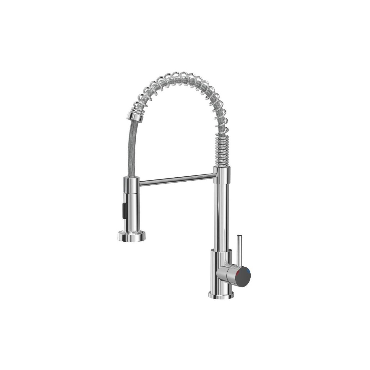 Acél konyhai keverőcsaptelep rugós, mozgó kifolyócsővel, zuhanyzó funkcióval.