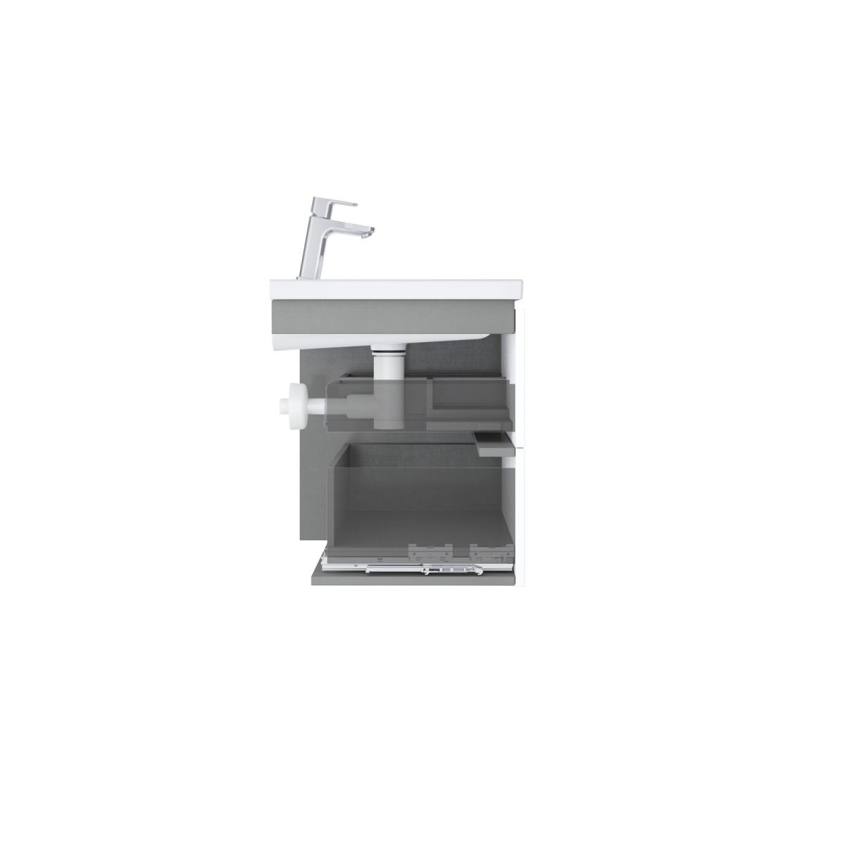 A szekrény belseje grafit színű. A két, hangtalanul záródó fiók rengeteg tárolóhelyet biztosít. A szekrényen előfúrt lyukak vannak a fogantyúk számára, amelyek nem részei a szekrénynek, és külön kell megvásárolni (2 db). Három szín közül lehet választani: fényes króm, fekete vagy fehér. A szekrényt a Comfort 80 mosdókagylóhoz tervezték, túlfolyó nélkül. A szekrény kombinálható fehér színű Comfort 80 pultlappal és pultos mosdókagylóval is (pl. Uni / Uni Slim sorozat). A szekrényt előre összeszerelve, a szerelőkészlettel (csavarok, zsanérok, dugók) együtt szállítjuk. Falra szerelésre tervezték.