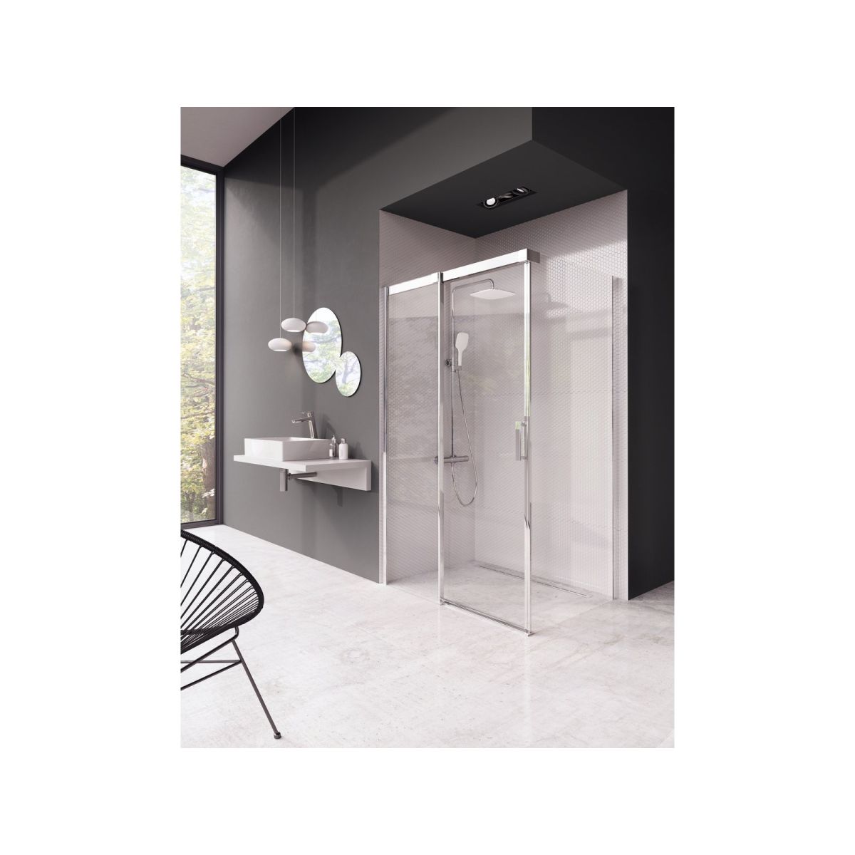 Zuhanykabin, amely kétrészes zuhanyajtóból áll, egy mozgatható elemmel, amely tolóajtót képez, és egy darabból álló rögzített falból. Beépítés csempézett fürdőszoba sarokba, közvetlenül a padlóra, beépített lineáris lefolyóval vagy lefolyó rácsokkal.