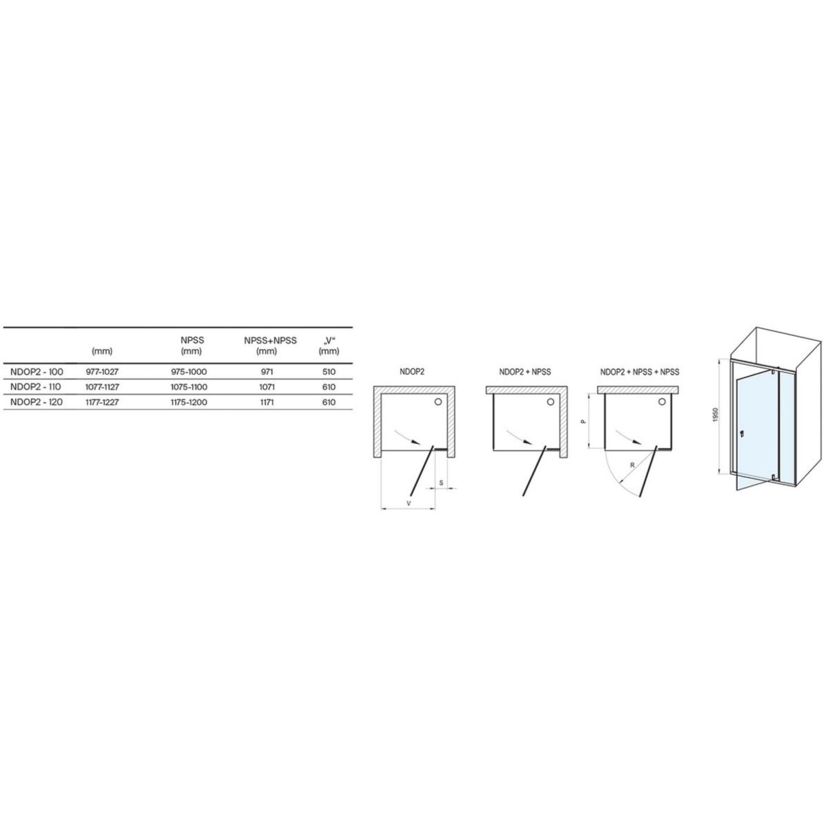 Az ajtó két NPSS rögzített fallal kombinálva U alakú zuhanykabint hozhat létre. Az NNPS hosszabbító profillal a termékeket 20 mm-rel meghosszabbíthatja, így azok mindkét oldalon akár 4 cm-es építési egyenetlenségekhez is tökéletesen illeszkednek.