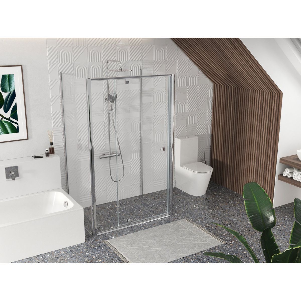 Kétrészes, forgószárnyas zuhanyajtó, fényes króm bevonatú kerettel, króm fogantyúval és zsanérokkal. Átlátszó üveggel, Ravak AntiCalc® védőbevonattal. Nyitási rendszer: forgószárnyas zsanér. A terméknek nincs jobb- vagy baloldali változata.