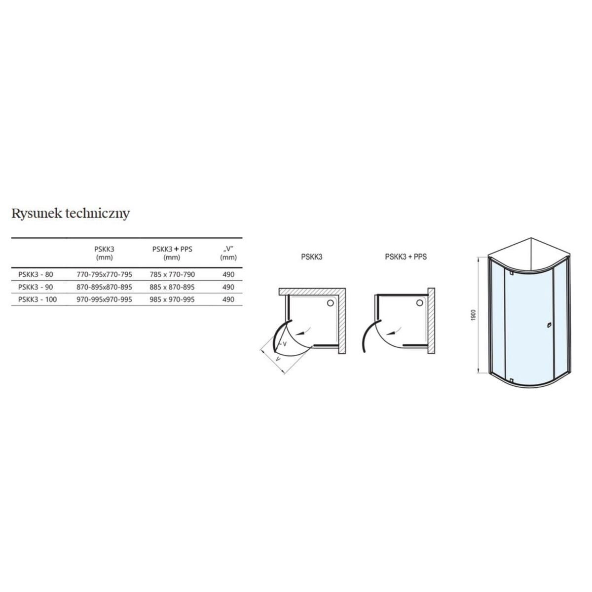 A termék két rögzített részből és egy ívelt üveg részből áll, amelyek együtt egy forgóajtót alkotnak. A termék 180°-os elforgatásával a beszerelés során választhat a bal- vagy jobbra nyíló ajtó között. Beszerelés a fürdőszoba csempézett sarkában, RAVAK zuhanytálcákra, R – 500 mm, vagy közvetlenül a padlóra, beépített lineáris lefolyóval vagy lefolyó rácsokkal. Ha a fürdőszobában nincs szabad sarok, a kabint kiegészítheti egy PPS rögzített fallal, és a falhoz szerelheti. A PNPS hosszabbító profilok segítségével a termék mindkét oldalán 4 cm-rel meghosszabbítható.