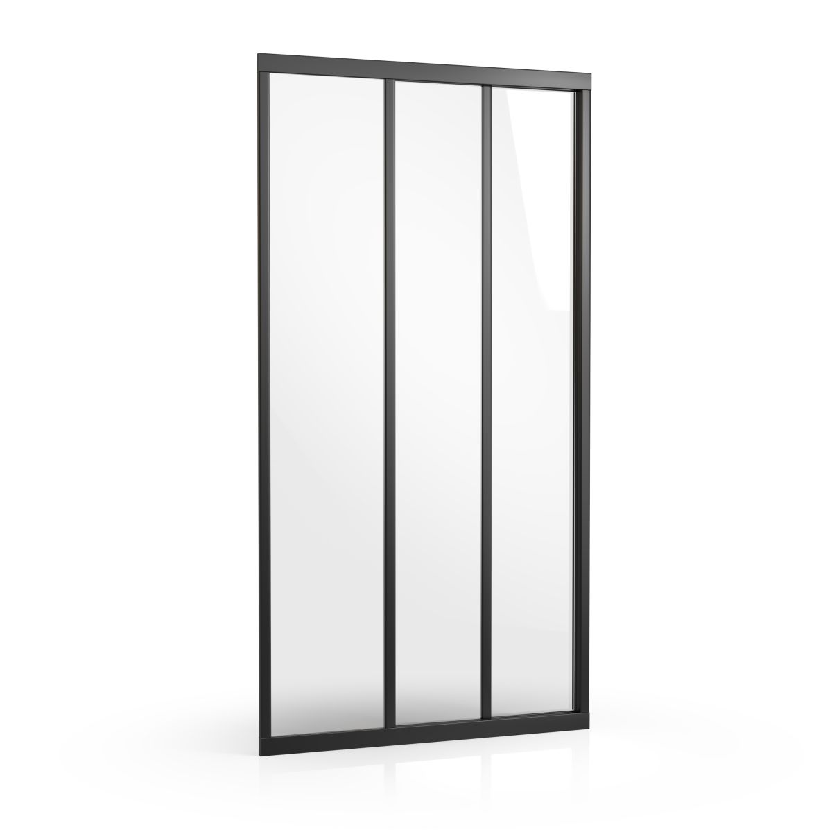 Háromrészes Supernova zuhanyajtó fekete kivitelben, átlátszó üvegbetéttel és Ravak AntiCalc® védőbevonattal. Csúszó nyitórendszer. A terméknek nincs jobb- vagy baloldali változata.