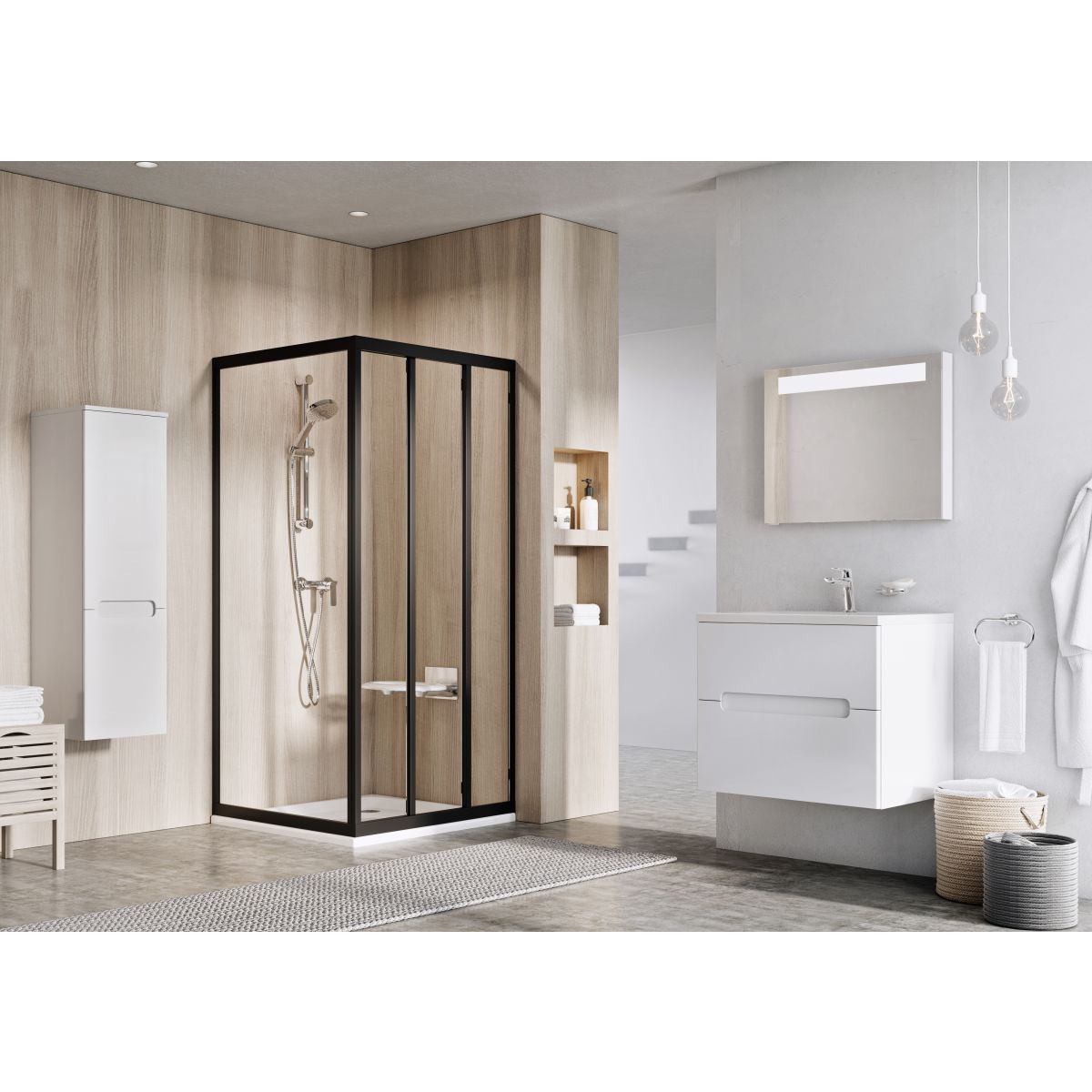 Háromrészes Supernova zuhanyajtó fekete kivitelben, átlátszó üvegbetéttel és Ravak AntiCalc® védőbevonattal. Csúszó nyitórendszer. A terméknek nincs jobb- vagy baloldali változata.
