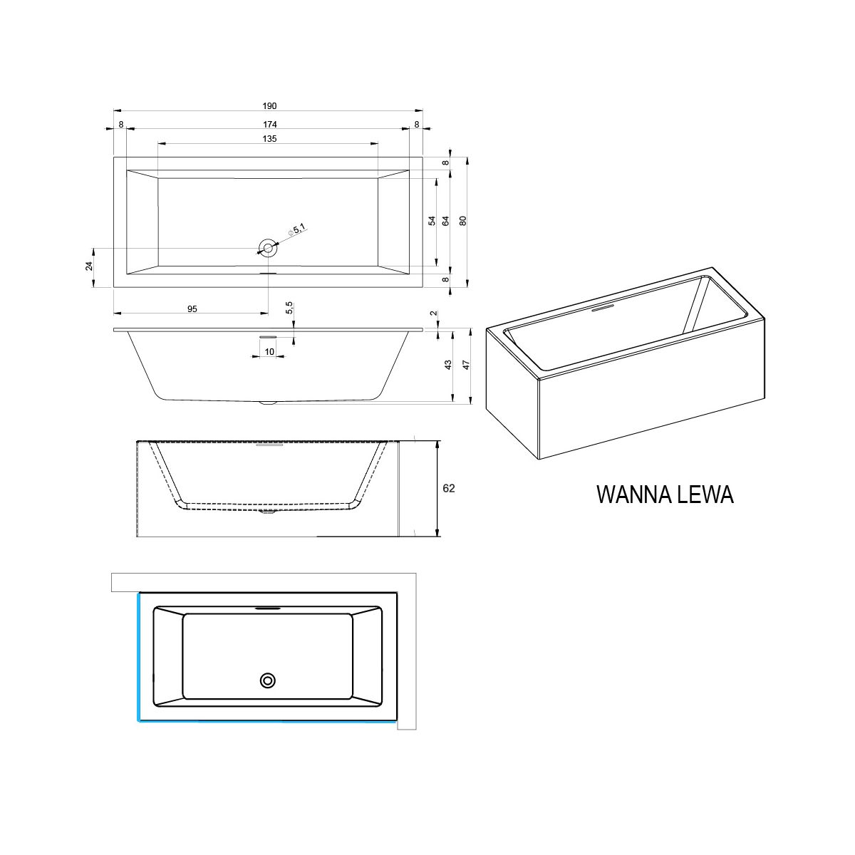 - a készlet tartalmaz egy kattintós szifont, lábakat és egy-egy burkolatot (a kád egyik rövidebb és hosszabb oldalához)