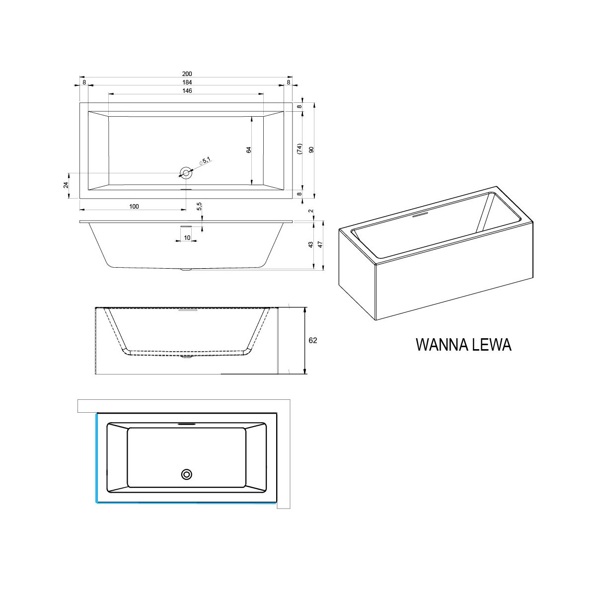 - a készlet tartalmaz egy kattintós szifont, lábakat és egy-egy burkolatot (a kád egyik rövidebb és hosszabb oldalához)