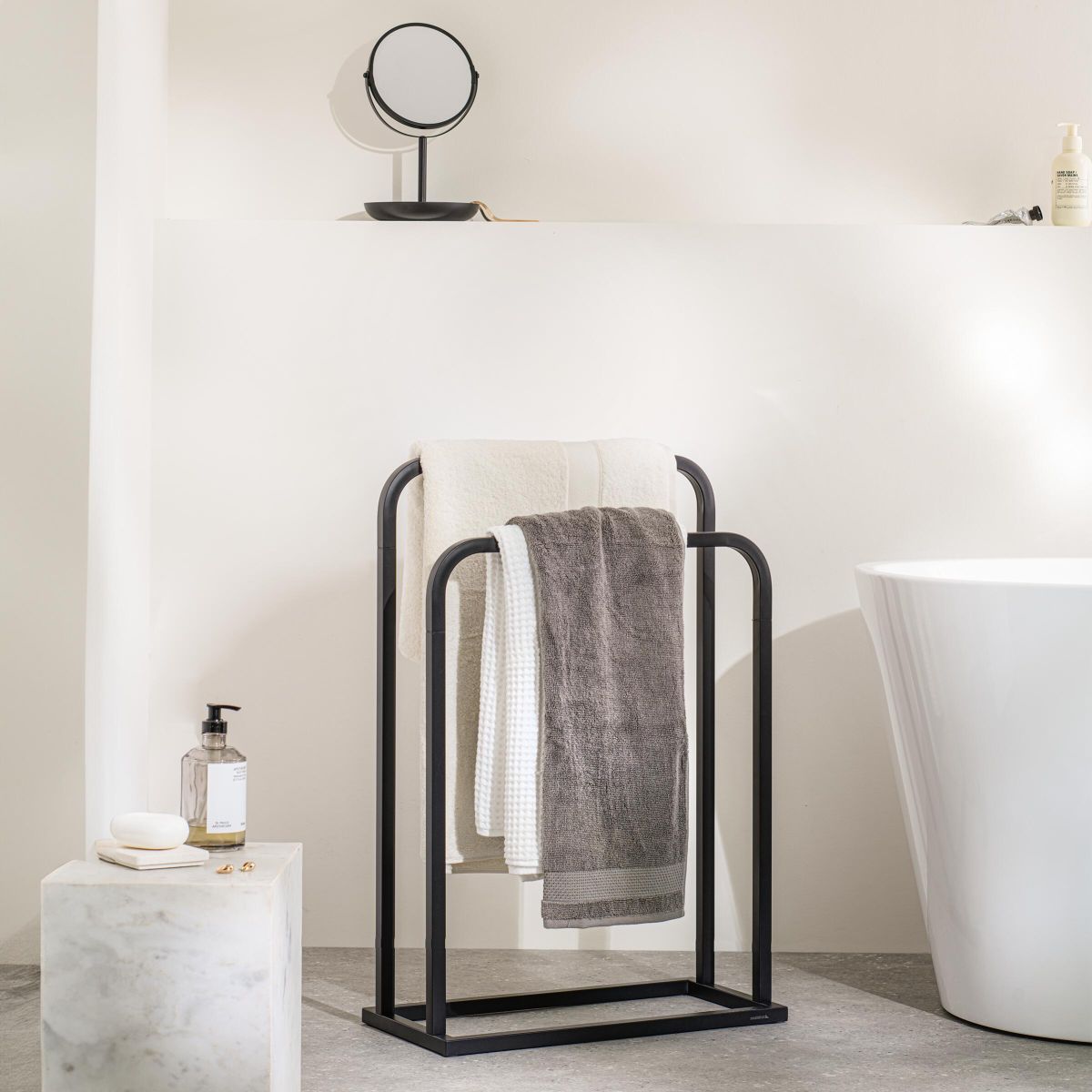 Önálló törülközőtartó – fekete kivitel és ipari stílus a modern fürdőszobához
