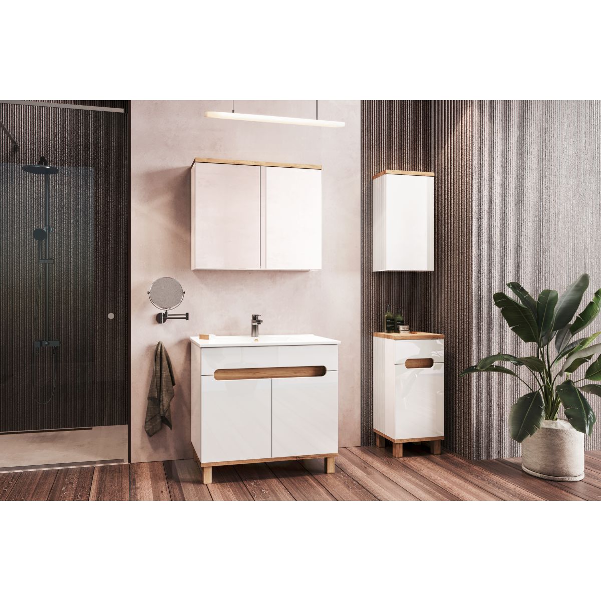 A szekrényfrontok felülete fényes fehér és lávamatt színben kapható. A fényes színű frontok az egész helyiséget ragyogóvá teszik. A tölgyarany kézműves kivitelű részletek melegséget és hangulatos bájt kölcsönöznek az így kialakított belső térnek. Az Ovo fürdőszobabútor-kollekció kiváló választás azoknak, akik értékelik az eredeti és praktikus megoldásokat. A sorozat termékei önszerelésre készültek.