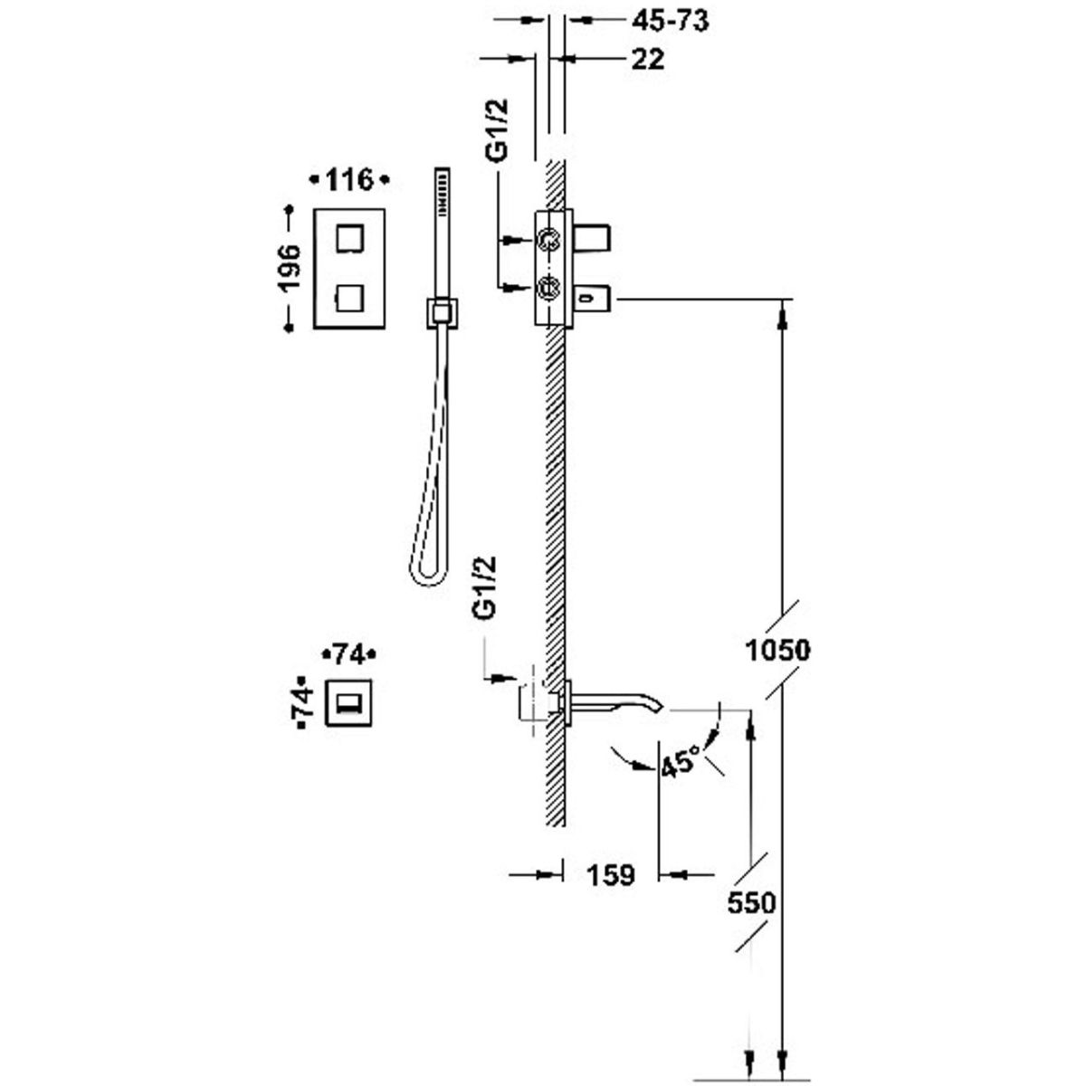 Készlet tartalma: csaptelep zuhany/kád váltóval, kádtöltő, kézi zuhanyfej, zuhany tömlő, szögcsatlakozás