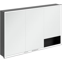 A tükröt körülvevő LED-szalag egyenletes megvilágítást biztosít, míg a beépített mosdóvilágítás és a megvilágított nyitott rekeszek hangulatos légkört teremtenek. A fényerő és a színhőmérséklet kényelmesen beállítható egy érzékelő vagy Smart Home vezérlő segítségével. A finom fogantyúk lehetővé teszik az ajtó kényelmes kinyitását ujjlenyomatok hagyása nélkül, a középen található dupla aljzat pedig további funkcionalitást biztosít.