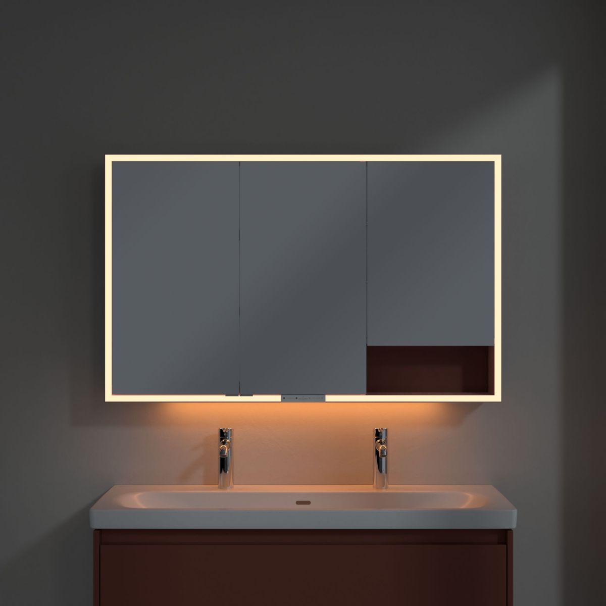 A tükröt körülvevő LED-szalag egyenletes megvilágítást biztosít, míg a beépített mosdóvilágítás és a megvilágított nyitott rekeszek hangulatos légkört teremtenek. A fényerő és a színhőmérséklet kényelmesen beállítható egy érzékelő vagy Smart Home vezérlő segítségével. A finom fogantyúk lehetővé teszik az ajtók kényelmes kinyitását ujjlenyomatok hagyása nélkül, a középen található dupla aljzat pedig további funkcionalitást biztosít.