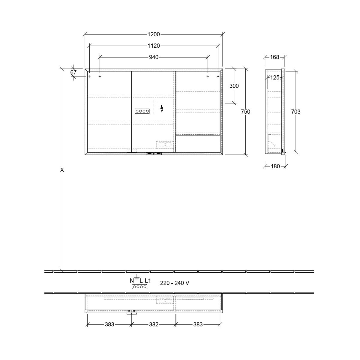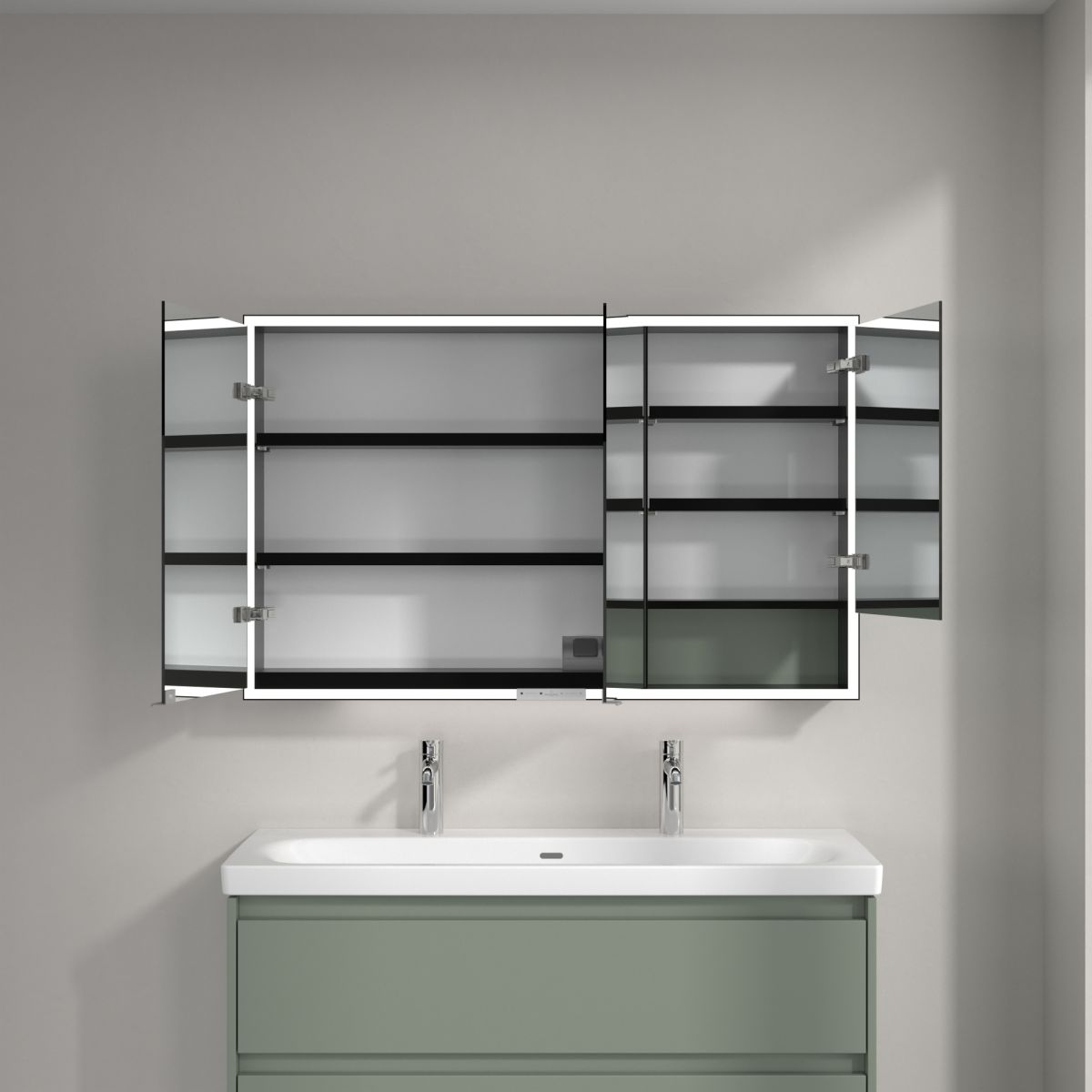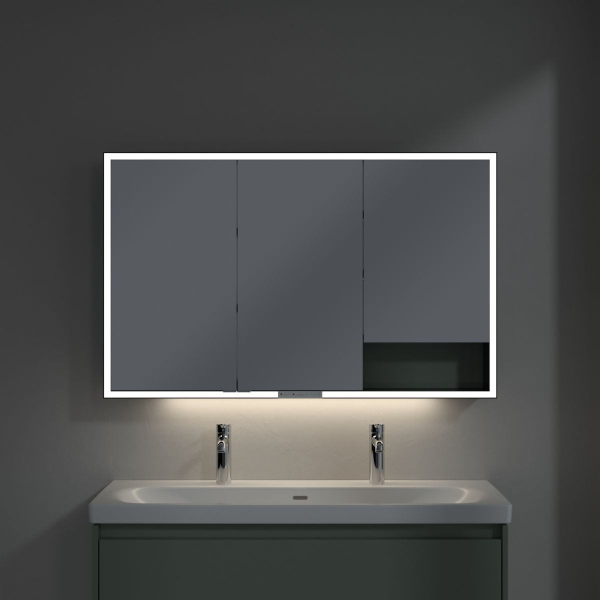 A tükröt körülvevő LED-szalag egyenletes megvilágítást biztosít, míg a beépített mosdóvilágítás és a megvilágított nyitott rekeszek hangulatos légkört teremtenek. A fényerő és a színhőmérséklet kényelmesen beállítható egy érzékelő vagy Smart Home vezérlő segítségével. A finom fogantyúk lehetővé teszik az ajtók kényelmes kinyitását ujjlenyomatok hagyása nélkül, a középen található dupla aljzat pedig további funkcionalitást biztosít.