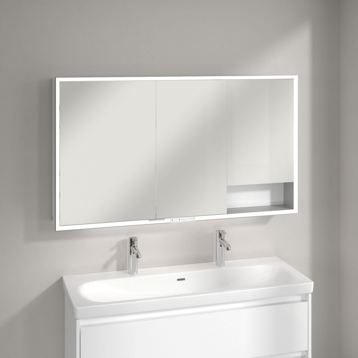 A tükröt körülvevő LED-szalag egyenletes megvilágítást biztosít, míg a beépített mosdóvilágítás és a megvilágított nyitott rekeszek hangulatos légkört teremtenek. A fényerő és a színhőmérséklet kényelmesen beállítható egy érzékelő vagy Smart Home vezérlő segítségével. A finom fogantyúk lehetővé teszik az ajtók kényelmes kinyitását ujjlenyomatok hagyása nélkül, a középen található dupla aljzat pedig további funkcionalitást biztosít.