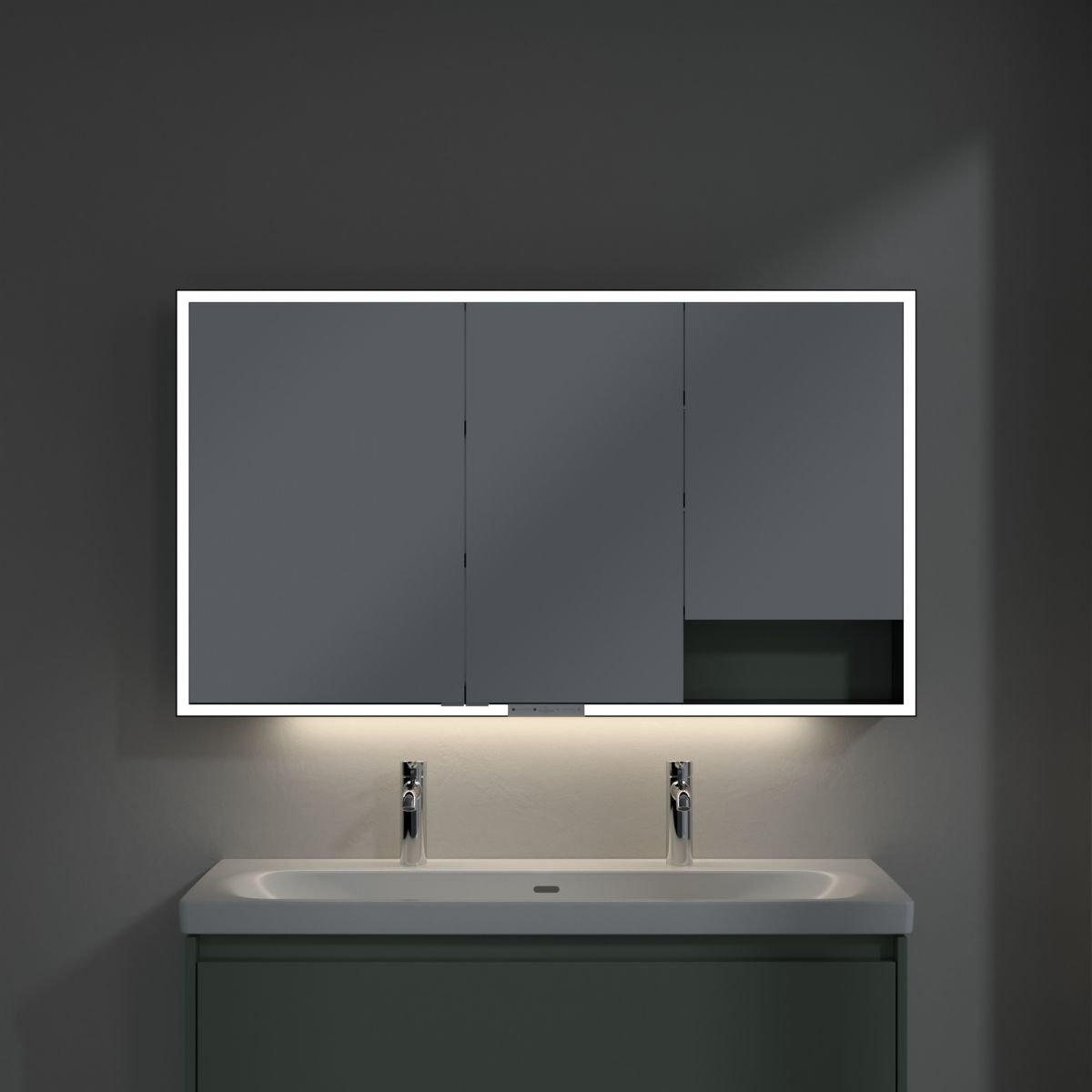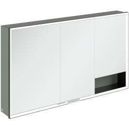 A tükröt körülvevő LED-szalag egyenletes megvilágítást biztosít, míg a beépített mosdóvilágítás és a megvilágított nyitott rekeszek hangulatos légkört teremtenek. A fényerő és a színhőmérséklet kényelmesen beállítható egy érzékelő vagy Smart Home vezérlő segítségével. A finom fogantyúk lehetővé teszik az ajtók kényelmes kinyitását ujjlenyomatok hagyása nélkül, a középen található dupla aljzat pedig további funkcionalitást biztosít.