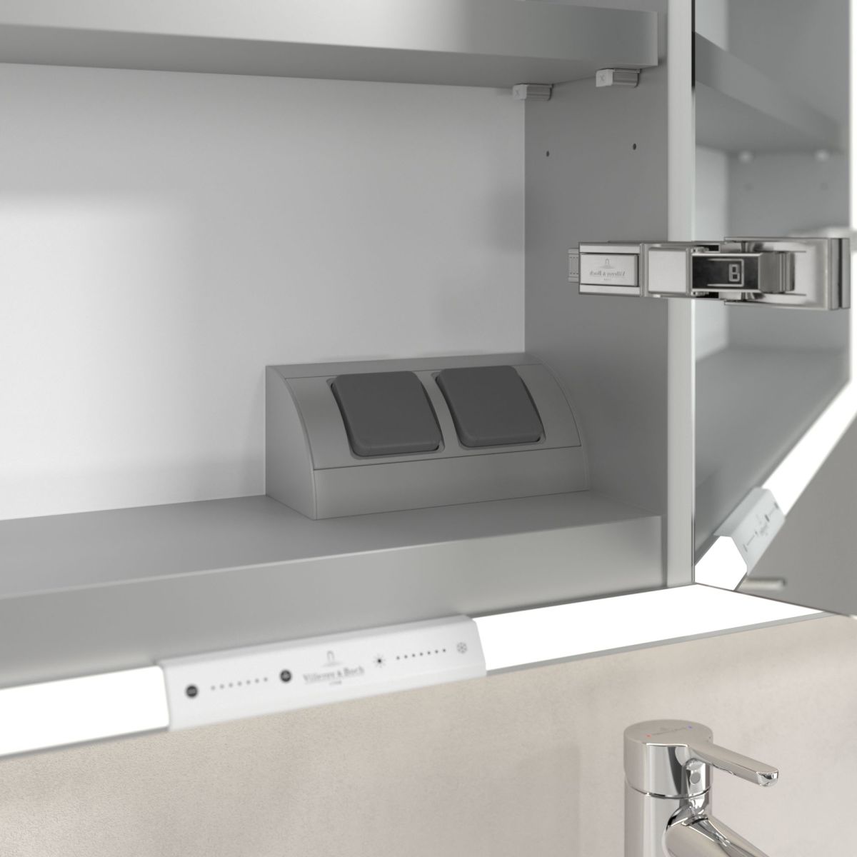 A tükröt körülvevő LED-szalag egyenletes megvilágítást biztosít, míg a beépített mosdóvilágítás és a megvilágított nyitott rekeszek hangulatos légkört teremtenek. A fényerő és a színhőmérséklet kényelmesen beállítható egy érzékelő vagy Smart Home vezérlő segítségével. A finom fogantyúk lehetővé teszik az ajtók kényelmes kinyitását ujjlenyomatok hagyása nélkül, a középen található dupla aljzat pedig további funkcionalitást biztosít.