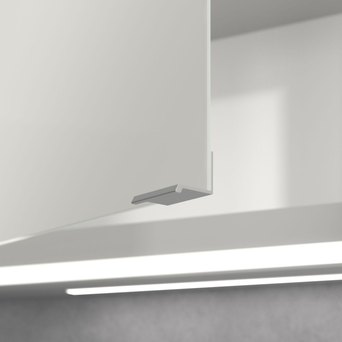 A tükröt körülvevő LED-szalag egyenletes megvilágítást biztosít, míg a beépített mosdóvilágítás és a megvilágított nyitott rekeszek hangulatos légkört teremtenek. A fényerő és a színhőmérséklet kényelmesen beállítható egy érzékelő vagy Smart Home vezérlő segítségével. A finom fogantyúk lehetővé teszik az ajtók kényelmes kinyitását ujjlenyomatok hagyása nélkül, a középen található dupla aljzat pedig további funkcionalitást biztosít.
