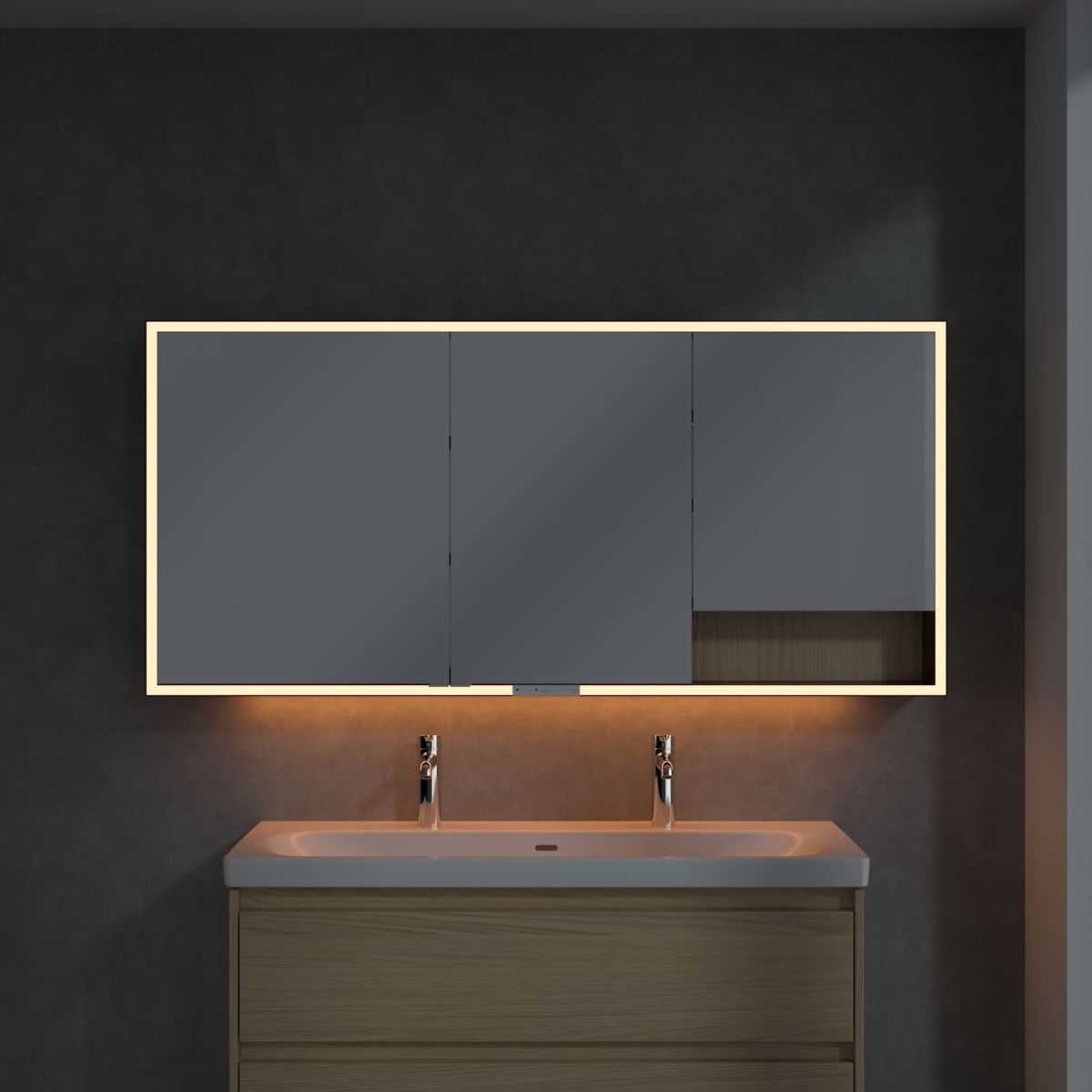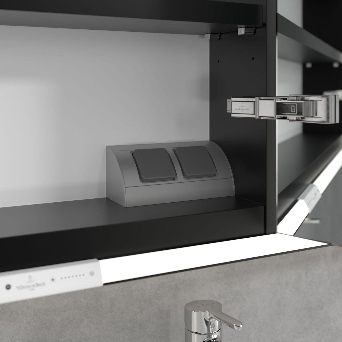 A tükröt körülvevő LED-szalag egyenletes megvilágítást biztosít, míg a beépített mosdóvilágítás és a megvilágított nyitott rekeszek hangulatos légkört teremtenek. A fényerő és a színhőmérséklet kényelmesen beállítható egy érzékelő vagy Smart Home vezérlő segítségével. A finom fogantyúk lehetővé teszik az ajtók kényelmes kinyitását ujjlenyomatok hagyása nélkül, a középen található dupla aljzat pedig további funkcionalitást biztosít.