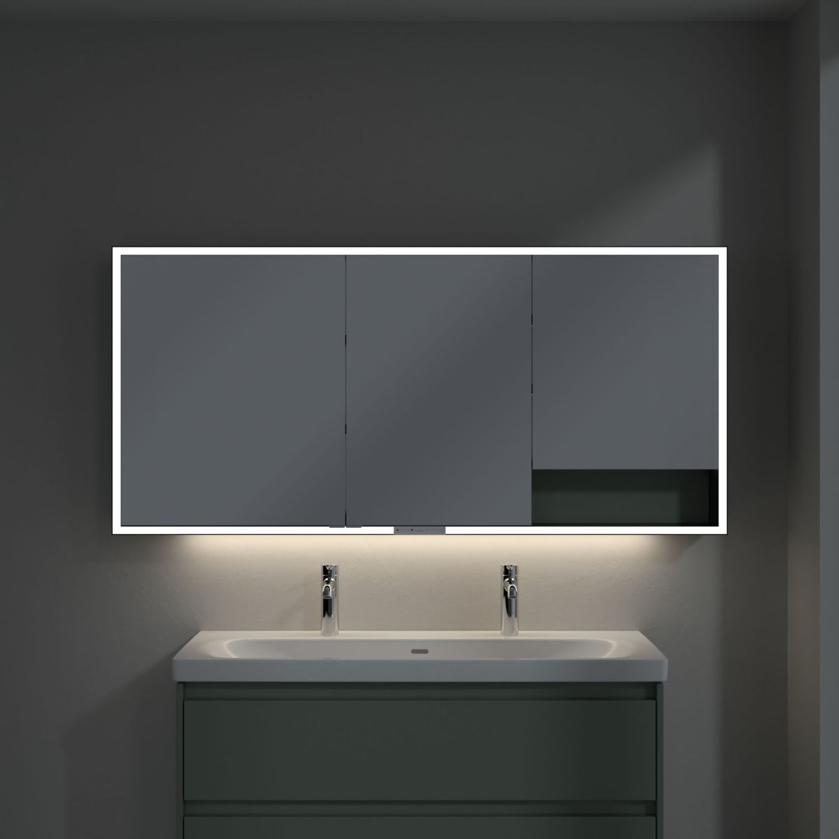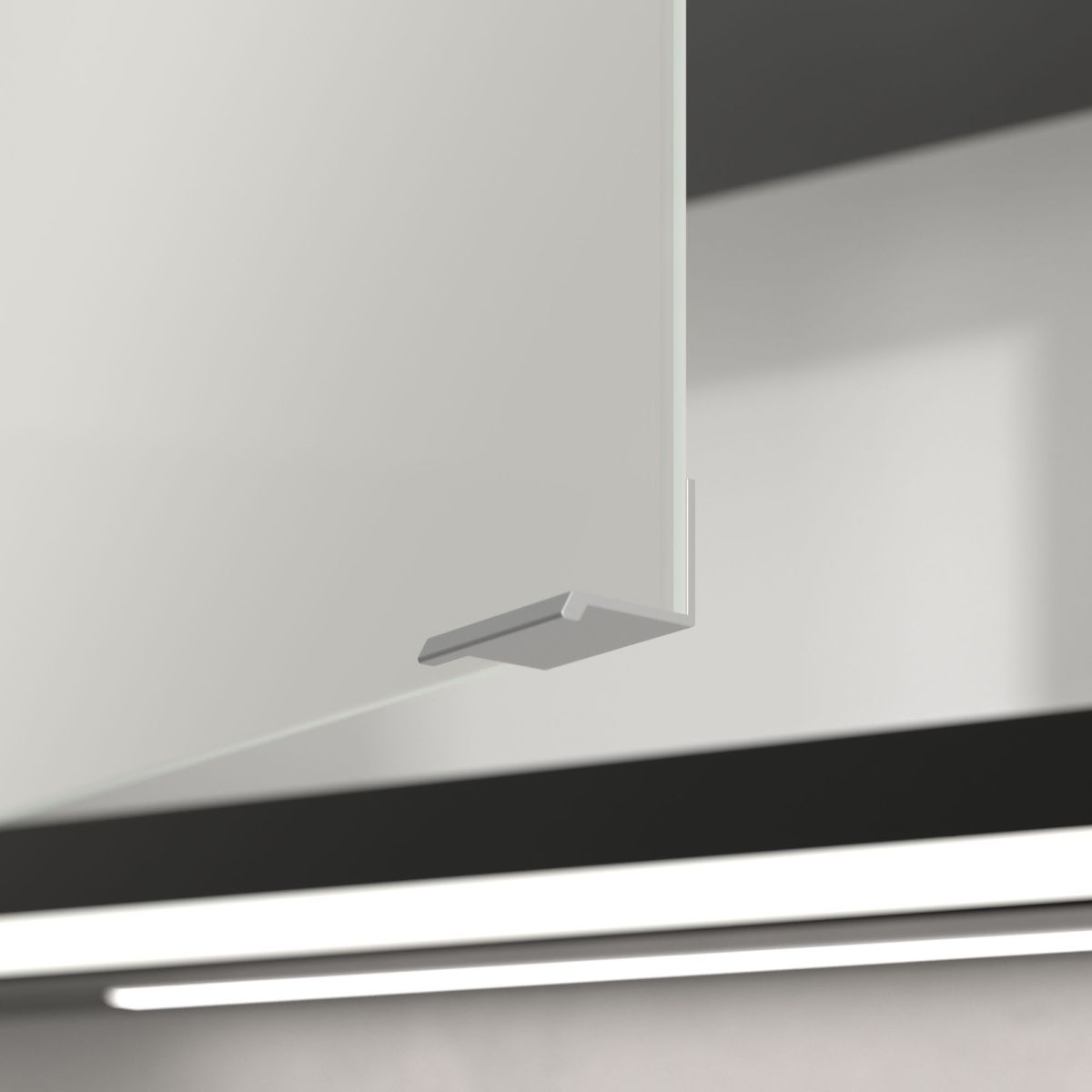 A tükröt körülvevő LED-szalag egyenletes megvilágítást biztosít, míg a beépített mosdóvilágítás és a megvilágított nyitott rekeszek hangulatos légkört teremtenek. A fényerő és a színhőmérséklet kényelmesen beállítható egy érzékelő vagy Smart Home vezérlő segítségével. A finom fogantyúk lehetővé teszik az ajtók kényelmes kinyitását ujjlenyomatok hagyása nélkül, a középen található dupla aljzat pedig további funkcionalitást biztosít.