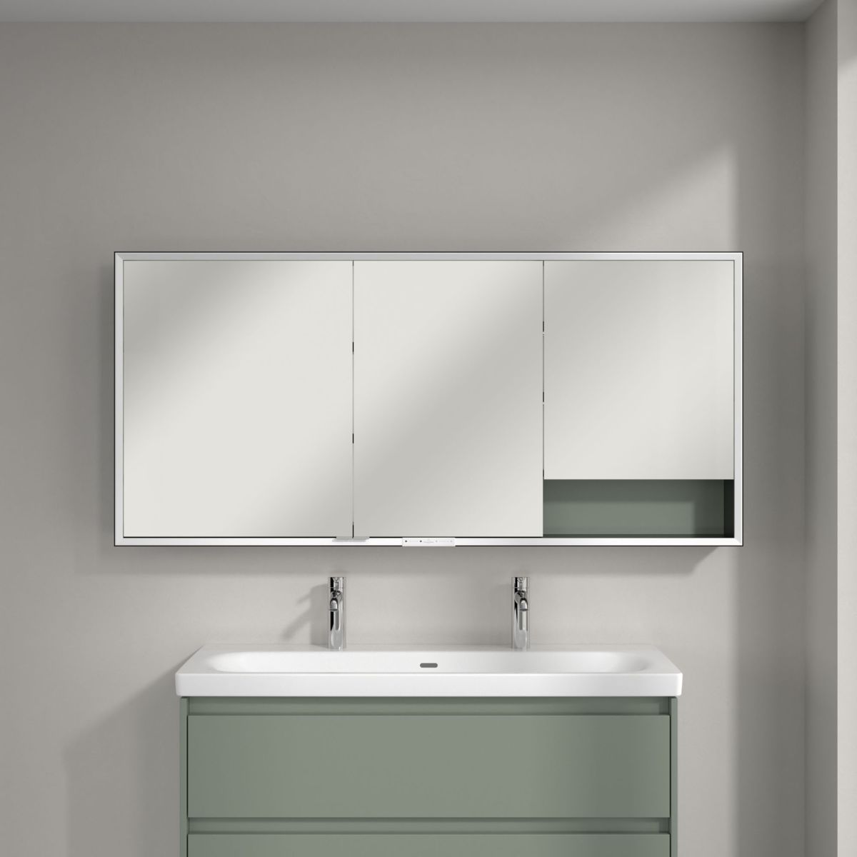 Zseniális és vonzó megoldás minimalista fürdőszobákhoz – a Villeroy & Boch My View+ beépíthető tükörszekrény intelligens funkciókkal és stílusos színakcentussal új szabványokat teremt a fürdőszobában. A zárt tárolórekeszekkel és nyitott rekeszekkel ellátott szekrény tökéletesen illeszkedik a falba, és rendkívül elegáns, minimalista hatást kelt. A színes hátsó panel egyedi színt és dizájnt kölcsönöz a fürdőszobának.