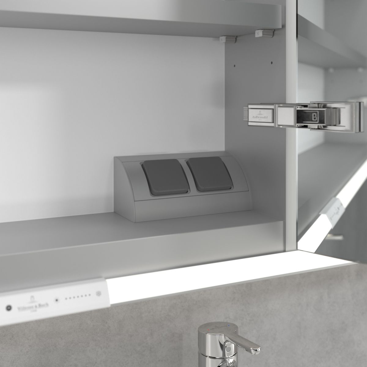 A tükröt körülvevő LED-szalag egyenletes megvilágítást biztosít, míg a beépített mosdóvilágítás és a megvilágított nyitott rekeszek hangulatos légkört teremtenek. A fényerő és a színhőmérséklet kényelmesen beállítható egy érzékelő vagy Smart Home vezérlő segítségével. A finom fogantyúk lehetővé teszik az ajtók kényelmes kinyitását ujjlenyomatok hagyása nélkül, a középen található dupla aljzat pedig további funkcionalitást biztosít.