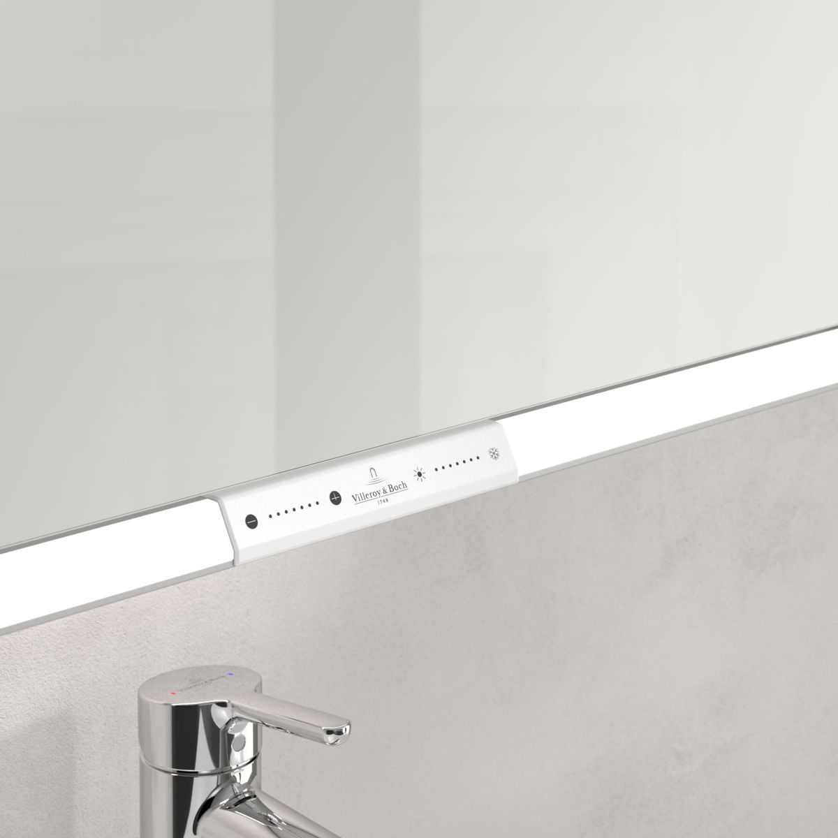 A tükröt körülvevő LED-szalag egyenletes megvilágítást biztosít, míg a beépített mosdóvilágítás és a megvilágított nyitott rekeszek hangulatos légkört teremtenek. A fényerő és a színhőmérséklet kényelmesen beállítható egy érzékelő vagy Smart Home vezérlő segítségével. A finom fogantyúk lehetővé teszik az ajtók kényelmes kinyitását ujjlenyomatok hagyása nélkül, a középen található dupla aljzat pedig további funkcionalitást biztosít.