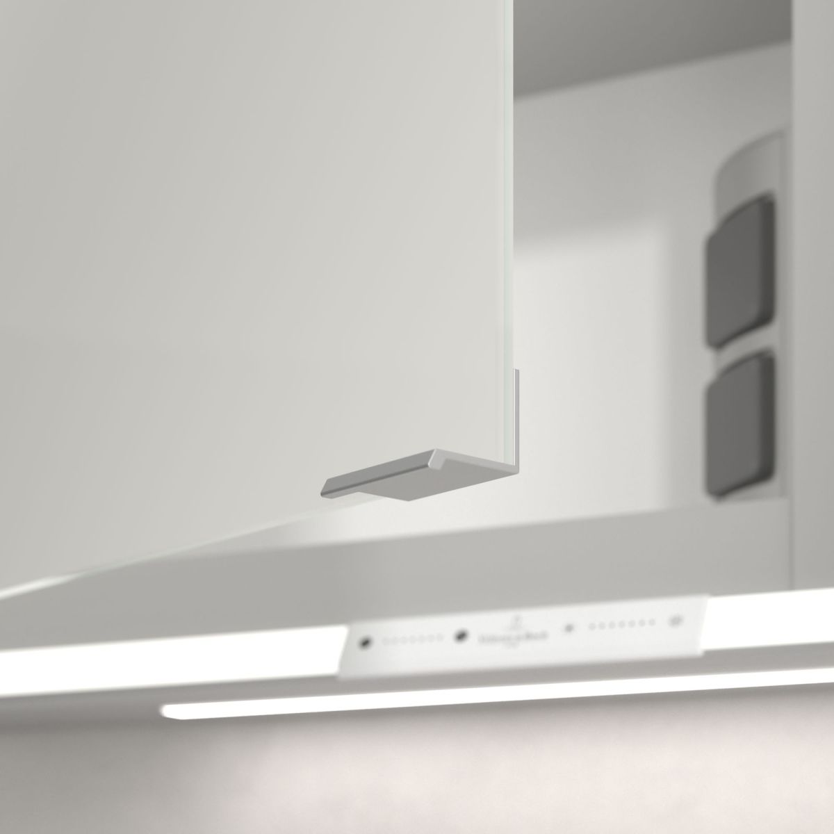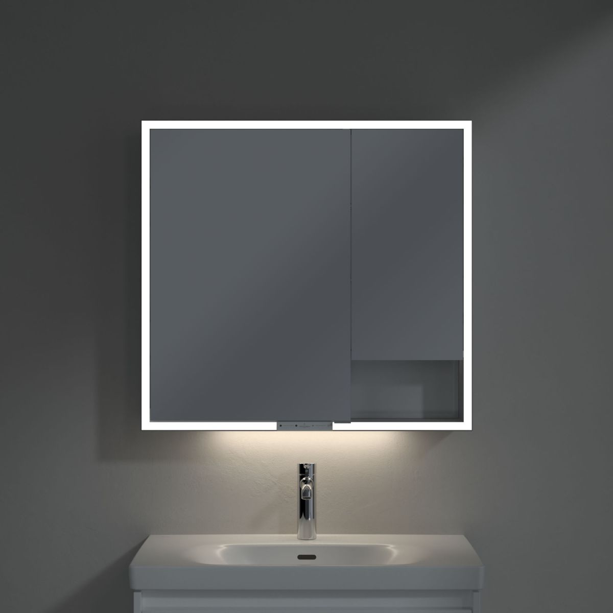 A tükröt körülvevő LED-szalag egyenletes megvilágítást biztosít, míg a beépített mosdóvilágítás és a megvilágított nyitott rekeszek hangulatos légkört teremtenek. A fényerő és a színhőmérséklet kényelmesen beállítható egy érzékelő vagy Smart Home vezérlő segítségével. A finom fogantyúk lehetővé teszik az ajtók kényelmes kinyitását ujjlenyomatok hagyása nélkül, a középen található dupla aljzat pedig további funkcionalitást biztosít.