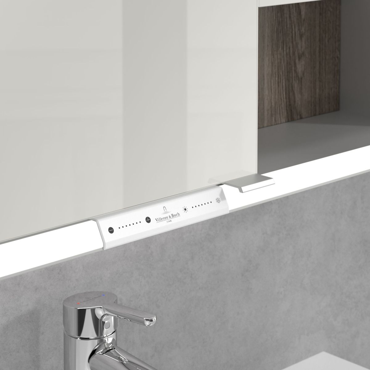A tükröt körülvevő LED-szalag egyenletes megvilágítást biztosít, míg a beépített mosdóvilágítás és a megvilágított nyitott rekeszek hangulatos légkört teremtenek. A fényerő és a színhőmérséklet kényelmesen beállítható egy érzékelő vagy Smart Home vezérlő segítségével. A finom fogantyúk lehetővé teszik az ajtók kényelmes kinyitását ujjlenyomatok hagyása nélkül, a középen található dupla aljzat pedig további funkcionalitást biztosít.
