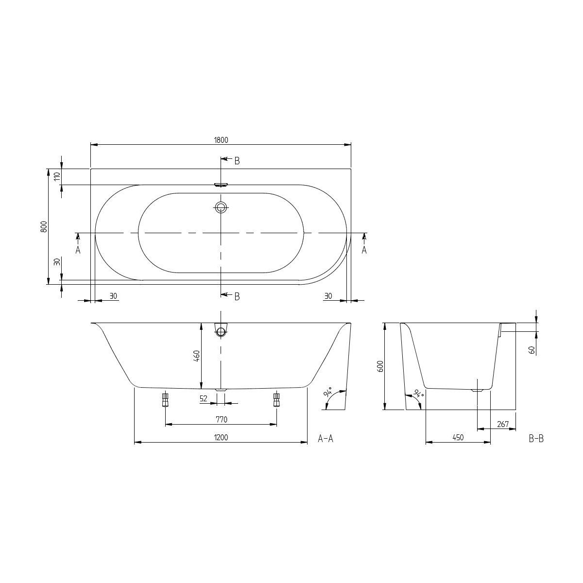 Villeroy & Boch Oberon 2.1 fal mellé szerelhető fűrdőkád 180x80 cm fehér UBQ180OBN9CL00VD01