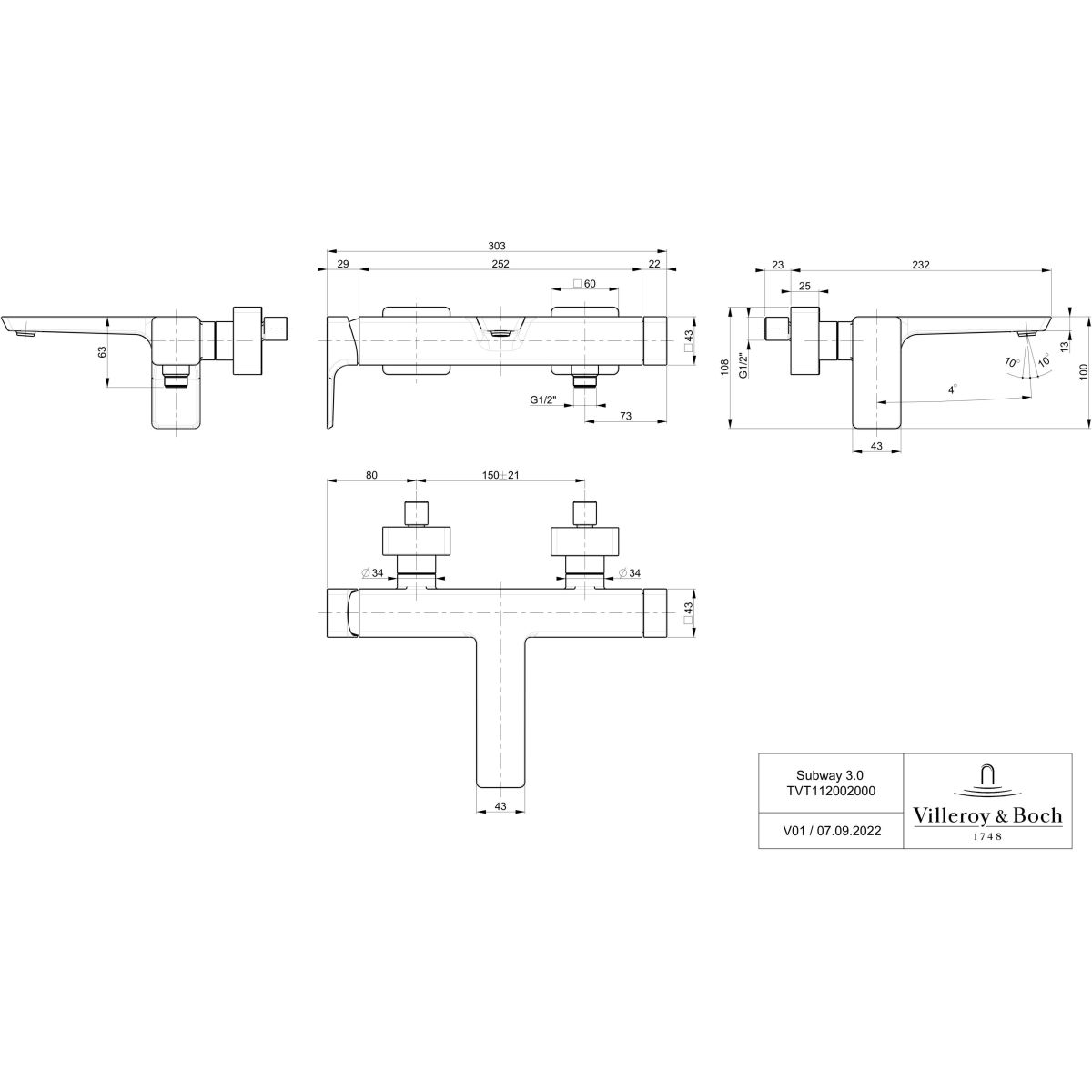 Villeroy & Boch Subway 3.0 kád és zuhany csaptelep fali króm TVT11200200061