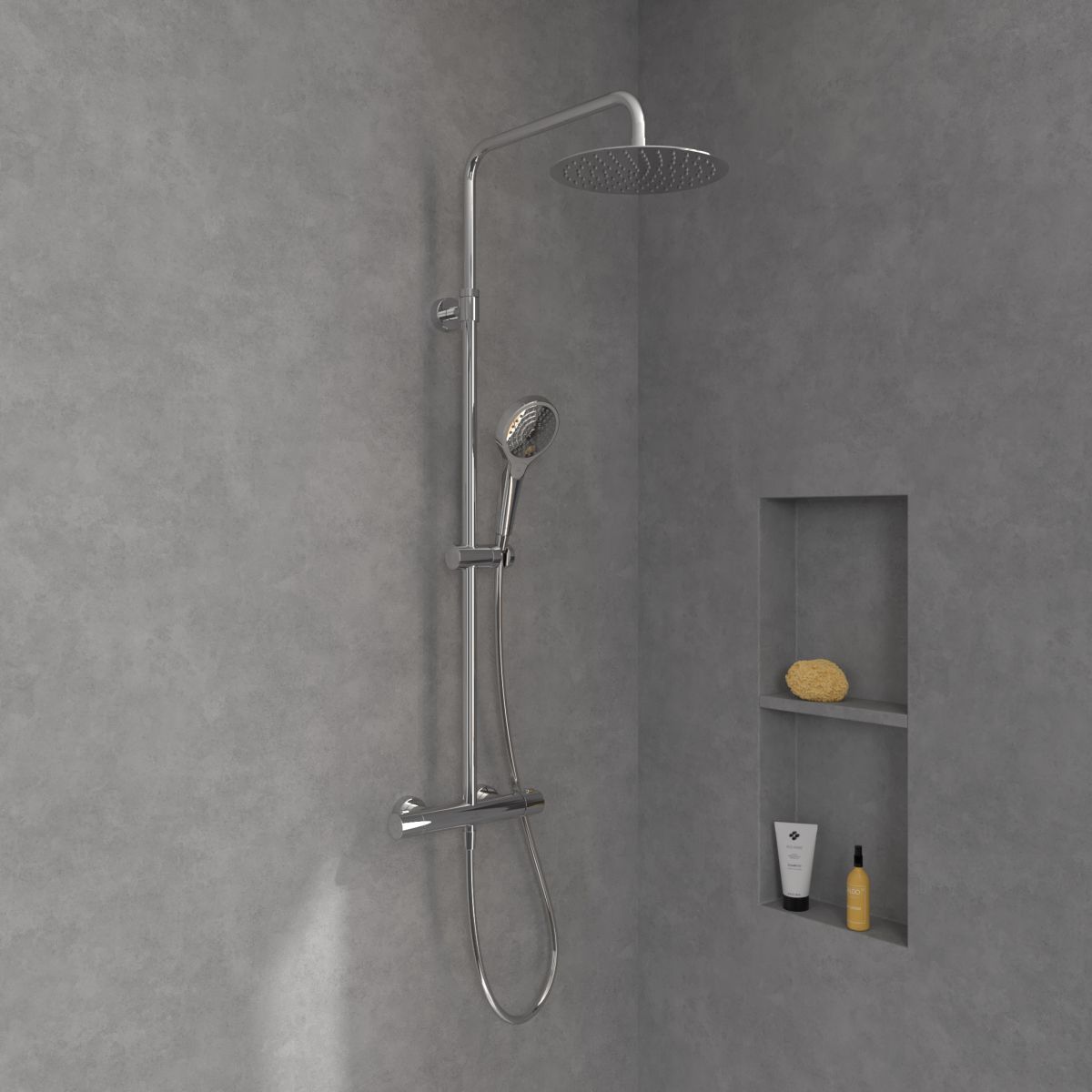 - a készlet a következőket tartalmazza: rúd, fejzuhany, termosztatikus keverő, zuhanykar, tömlő és kézi zuhany